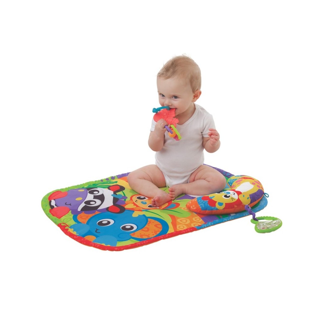 У комплекті з килимком передбачені дві додаткові іграшки. Брязкальце своїми звуковими ефектами розвеселить малюка, а прорізувач допоможе дитині під час появи перших зубчиків. Іграшки можна прикріпити на килимок або зняти, щоб пограти ними окремо або взяти з собою на прогулянку або в подорож.