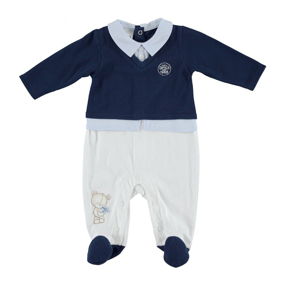 Цей комбінезон для немовляти iDO оригінальний та симпатичний. Він імітує однотонну сорочку з комірцем, светр з v подібним вирізом і однотонні штанці з контрастними шкарпетками. Застібається на спинці кнопками, штанці теж на кнопках, щоб можна було швидко і легко змінити підгузок.