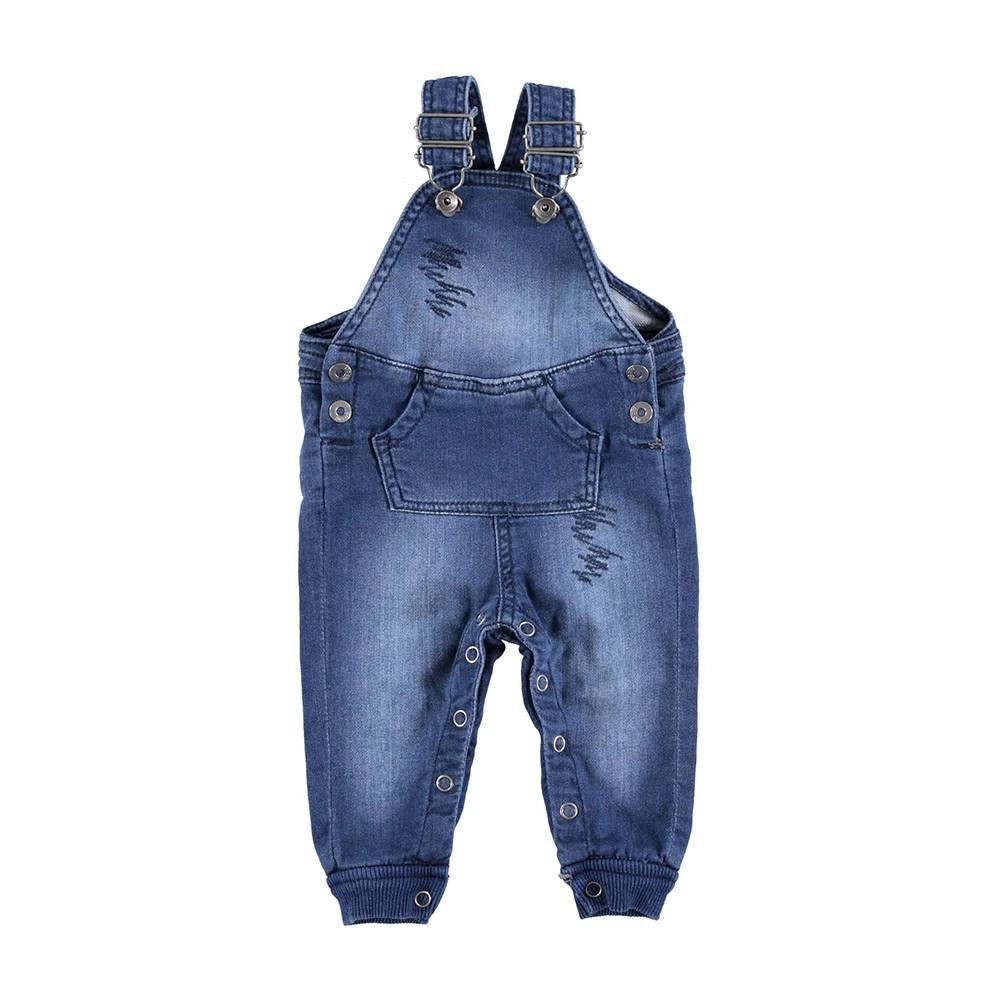 Така практична та універсальна річ подарує вашій дитині комфорт та затишок, не завдасть незручностей при носінні, і збереже красивий зовнішній вигляд надовго. Спереду джинси для малюка оздоблені малюнком і кишенею-кенгуру, збоку застібається на гудзики, внизу широка трикотажна гумка. Бретели застібаються на гудзики, між ніжками є кнопки для зручності перевдягання підгузки.