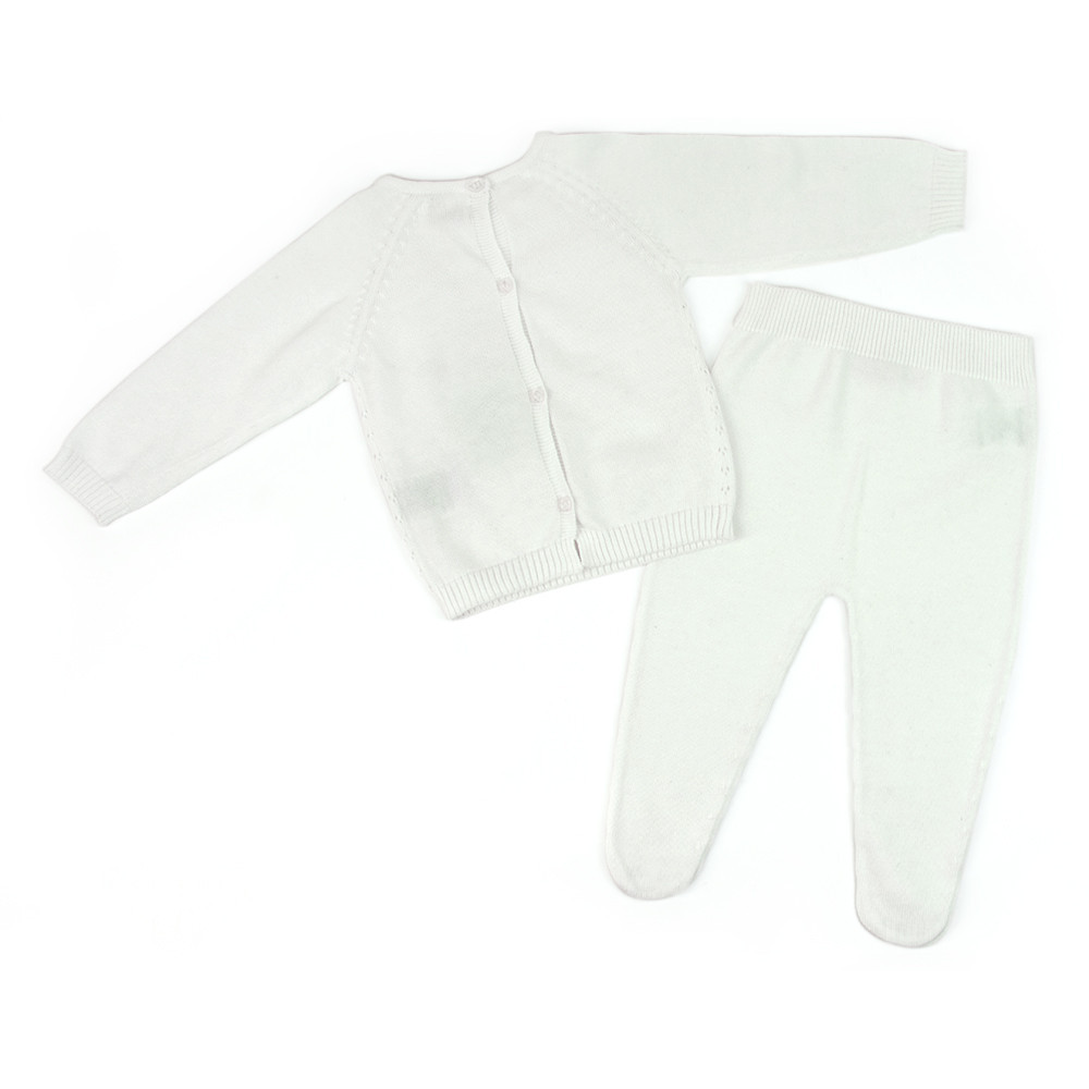 В'язаний комплект Babybol для новонародженого малюка складається з 2 предметів, виготовлених зі 100% бавовни. Трикотажний светр рукава - реглан, застібка гудзика на спині по всій довжині, спереду прикрашений ажурною в'язкою. Всередині трикотажного пояса штанів вшита гумка. Простий, зручний, стильний комплект чудова пропозиція на виписку з пологового будинку для святкового заходу.