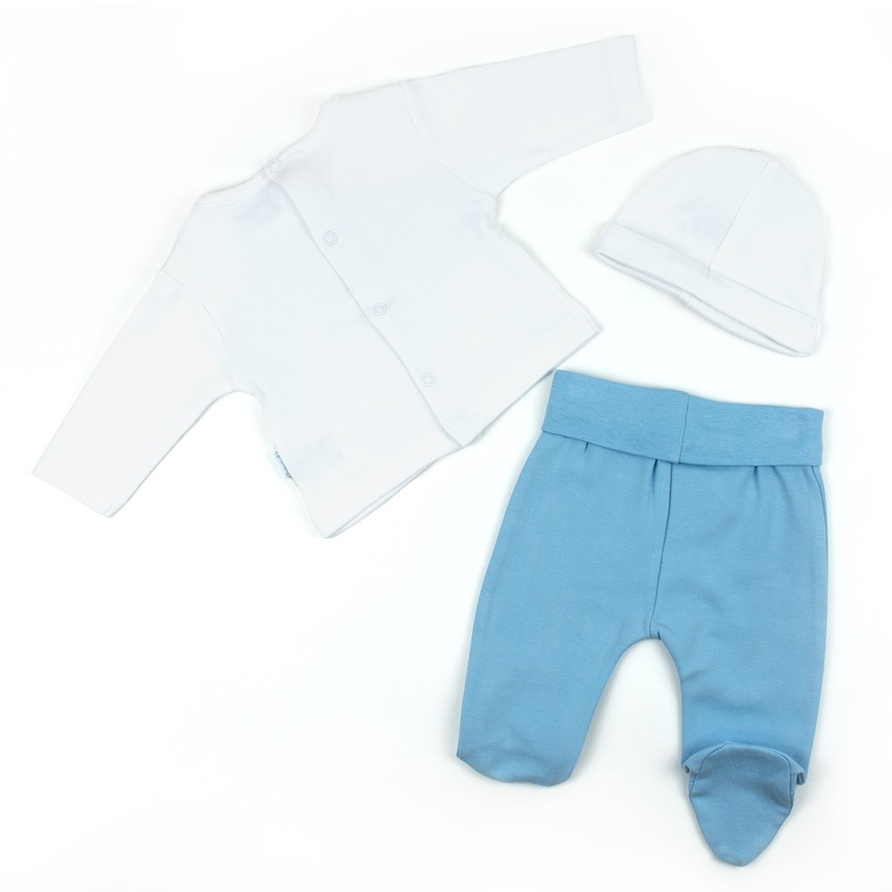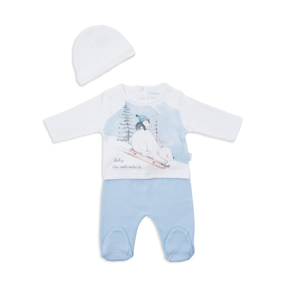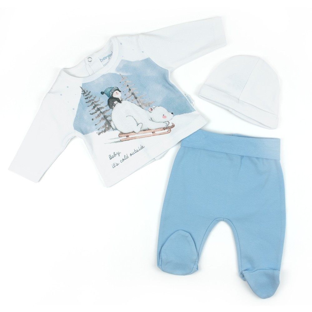 Зручний, модний, стильний комплект Babybol складається з реглану, повзунка та шапочки виконаних зі 100% бавовни. Комплект стане незамінним варіантом для Вашого новонародженого хлопчика. Перед регланом прикрашений зимовим малюнком, застібається на спинці кнопками. Повзунок в тон візерунка, на талії широка трикотажна гумка. Шапочка з відворотом.