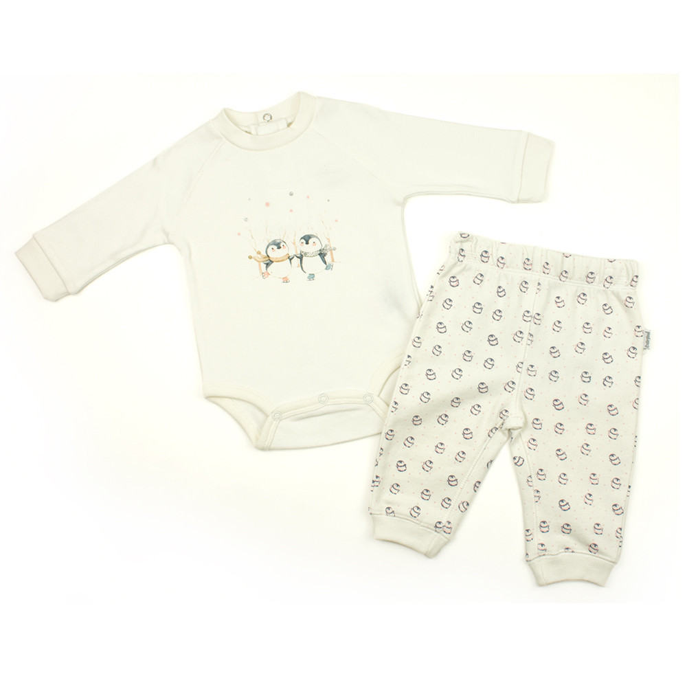 Чудова та практична пропозиції для малюка - трикотажний комплект Babybol зі 100% бавовни складається з боді з рукавами та штанців. Спереду боді прикрашає веселий малюнок на зимову тематику. Застібається боді на кнопки розташовані знизу, для зручності при зміні підгузка та швидкого одягання. Горловина та низ боді на трикотажній бейці, рукави на манжетах. Кольорові штанці з вшитою гумкою на талії та манжетами на кісточці доповнюють комплект.