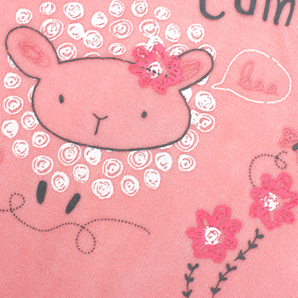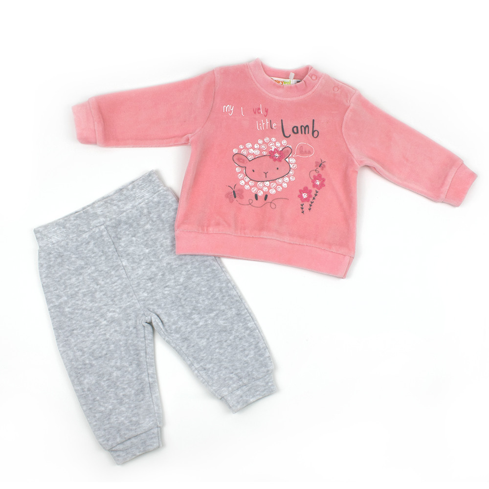 Трикотажний велюровий комплект Babybol для новонародженої дівчинки складається з реглану та штанців. Реглан спереду прикрашений веселим дитячим принтом, на плечі є кнопки для легкого та швидкого одягання. Низ штанців на манжетах, пояс на талії на гумці.
