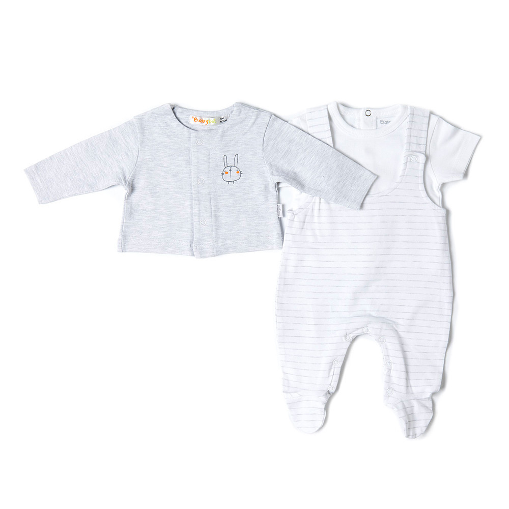 Елегантний трикотажний комплект Babybol для новонародженого хлопчика складається з толстовки, футболки та повзунків, виготовлений з бавовни. Толстовка з круглою горловиною декорована принтом у вигляді звірятка, що застібається спереду на кнопки. У однотонної футболки застібка розташована на спинці – кнопки. Смугасті повзунки на шлейках із кнопками, що дозволяє регулювати зростання малюка.
