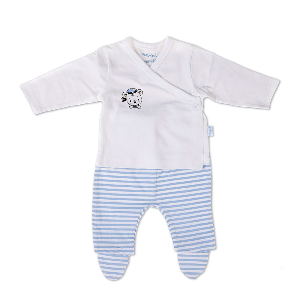 Чудова та практична пропозиція для малюка - трикотажний комплект Babybol виготовлений з бавовни складається з распашонки та повзунка. Однотонна распашонка з V подібним вирізом застібається на боці кнопкою і прикрашена милим дитячим принтом. Повзунки смугасті, широкий однотонний трикотажний пояс не тисне на животик малюка.