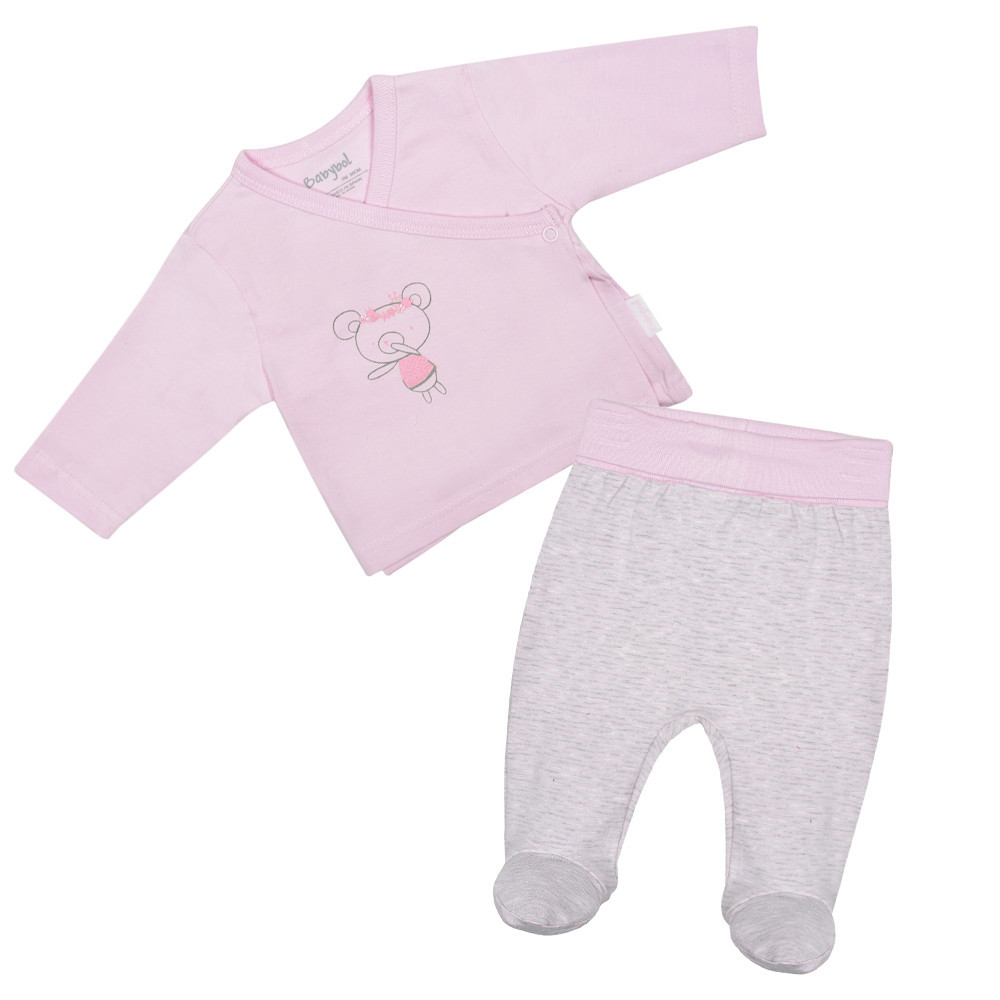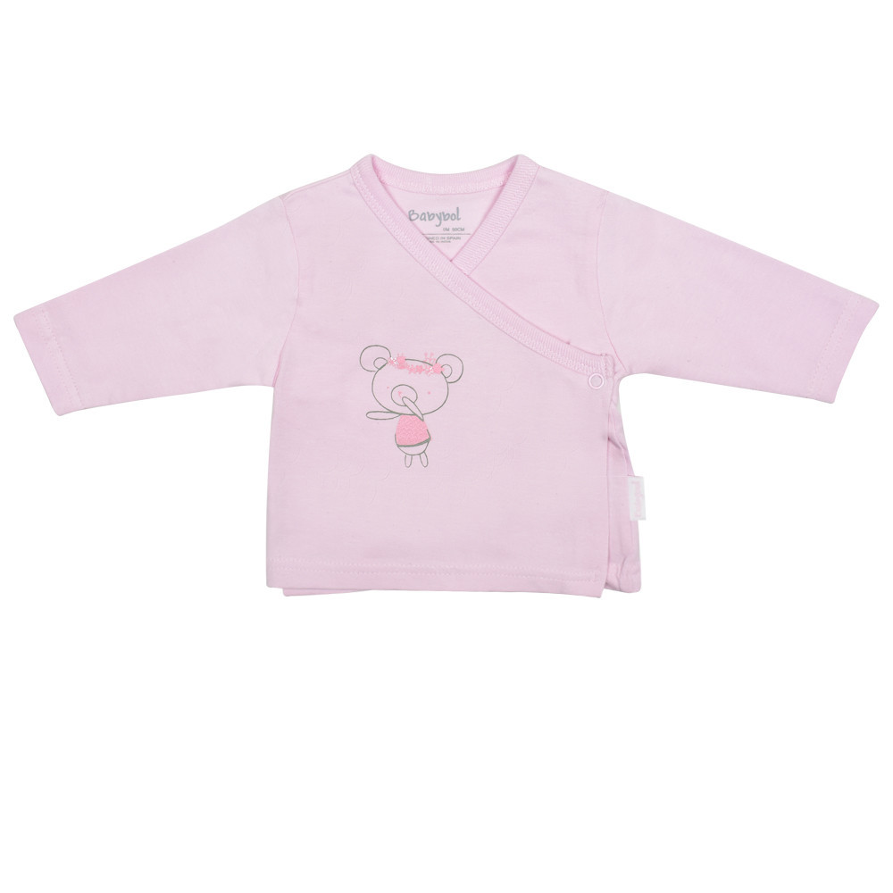 Чудова та практична пропозиції для малюка - трикотажний комплект Babybol виготовлений з бавовни складається з распашонки та повзунка. Однотонна распашонка з V подібним вирізом застібається на боці кнопкою та прикрашена милим дитячим принтом. Повзунки рожевий меланж на широкому однотонному трикотажному поясі не тисне на животик малечі.
