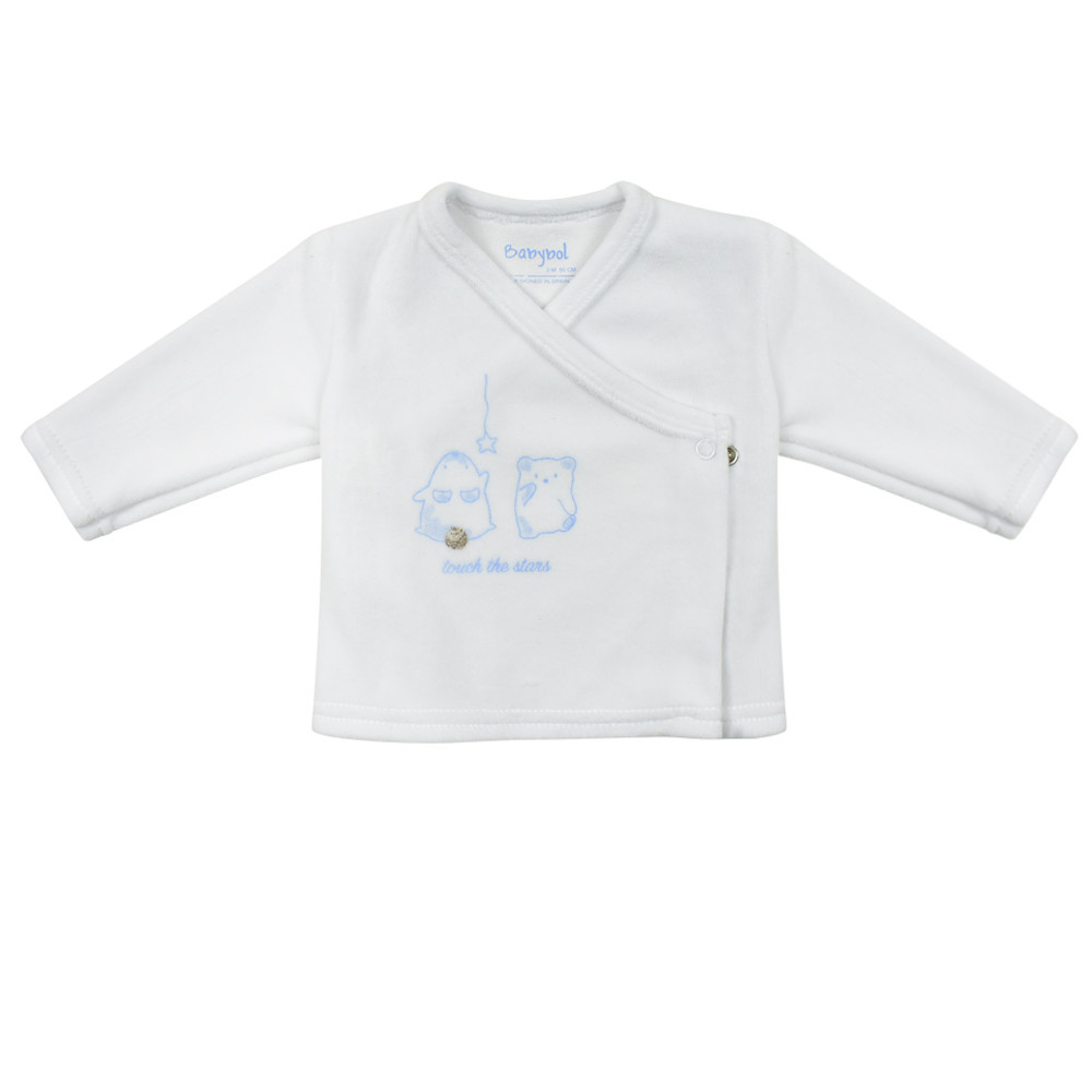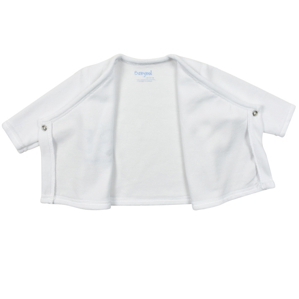 Чудова і практична пропозиція BabyBol для маляка - трикотажний велюровий комплект складається з розпашонки, повзунка і шапочки. Однотонна розпашонка з V подібним вирізом застібається збоку кнопкою і прикрашена принтом. Повзунки смугасті, пояс з внутрішньої гумкою, знизу прикрашені вишивкою і апплікацією. Однотонна шапочка з відворотом.