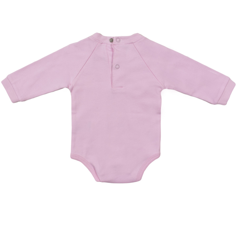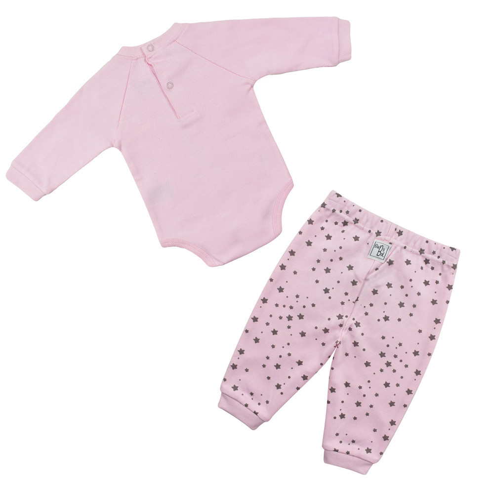 Трикотажний комплект для дівчинки від Babybol складається з боді і штанців виготовлених з 100% бавовни. Боді з довгим рукавом реглан прикрашає спереду принт, застібка кнопки розташована на спинці. Кнопки між ніжок полегшують і прискорюють зміну підгузка. Штанішки прикрашає принт по всьому полю. Пояс на талії з вшитой гумкою. Манжети на рукавах, на штанинах, горловина на подвійний еластичний трикотажної гумки.