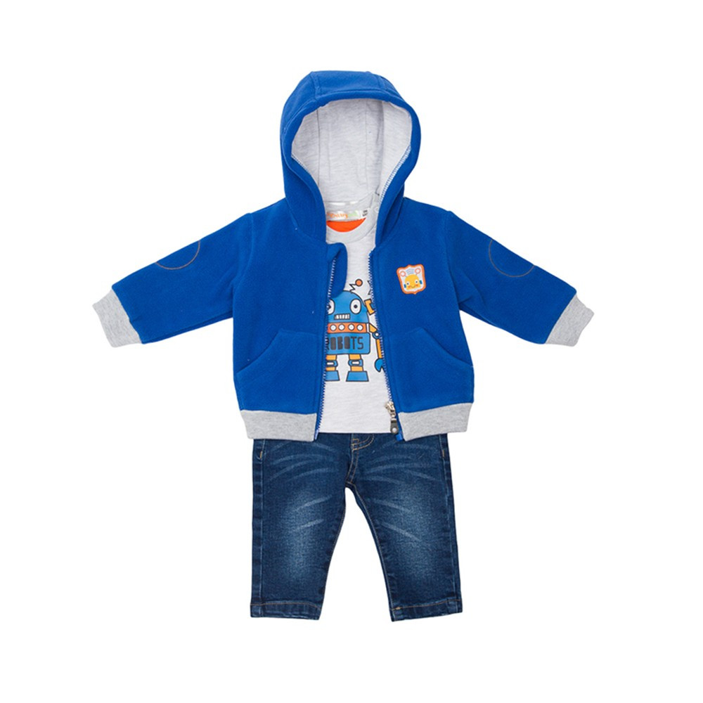 Стильний, модний та зручний комплект Babybol стане незамінним варіантом для щоденних прогулянок. Флісову толстовку з каптуром на блискавці на бавовняній трикотажній підкладці прикрашає кишеня кенгуру. Еластичні манжети на рукавах та пояс на талії одного кольору з підкладкою. Трикотажний реглан з 100% бавовни з веселим дитячим малюнком спереду, має застібки кнопки тільки для розмірів 12м, 18м, 24м. Завершують прекрасний ансамбль м'які джинси з гумкою, що вшита в пояс, яка затягується, що дозволяє регулювати обсяг талії.