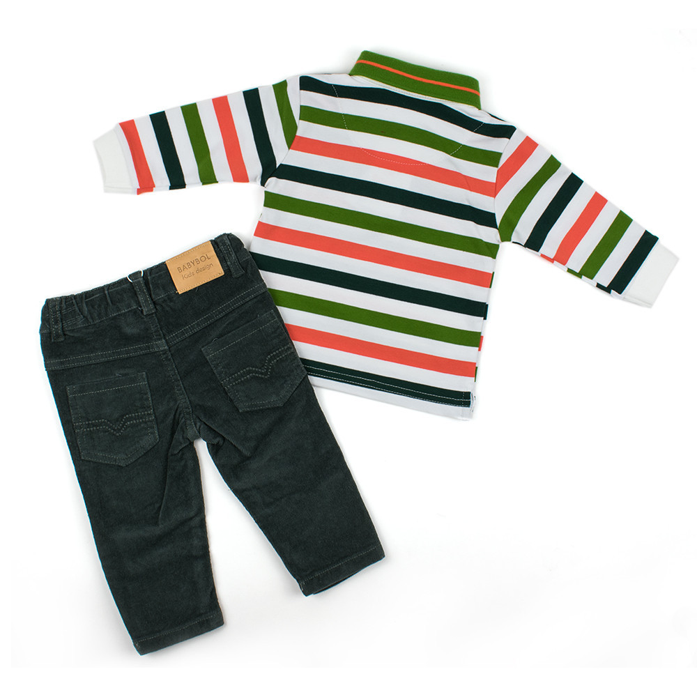 Чудовий стильний комплект Babybol складається з реглану поло та вельветових брюк неодмінно сподобається Вашій дитині. Яскравий смугастий реглан поло з однотонними манжетами, аплікацією, невеликими розрізами з боків виглядає модно та стильно. Застібається реглан на гудзики. М'які вельветові брюки поповнять гардероб Вашої дитини. Об'єм талії в брюках регулюється вшитою в поясі гумкою, яка затягується і застібається на внутрішні гудзики.