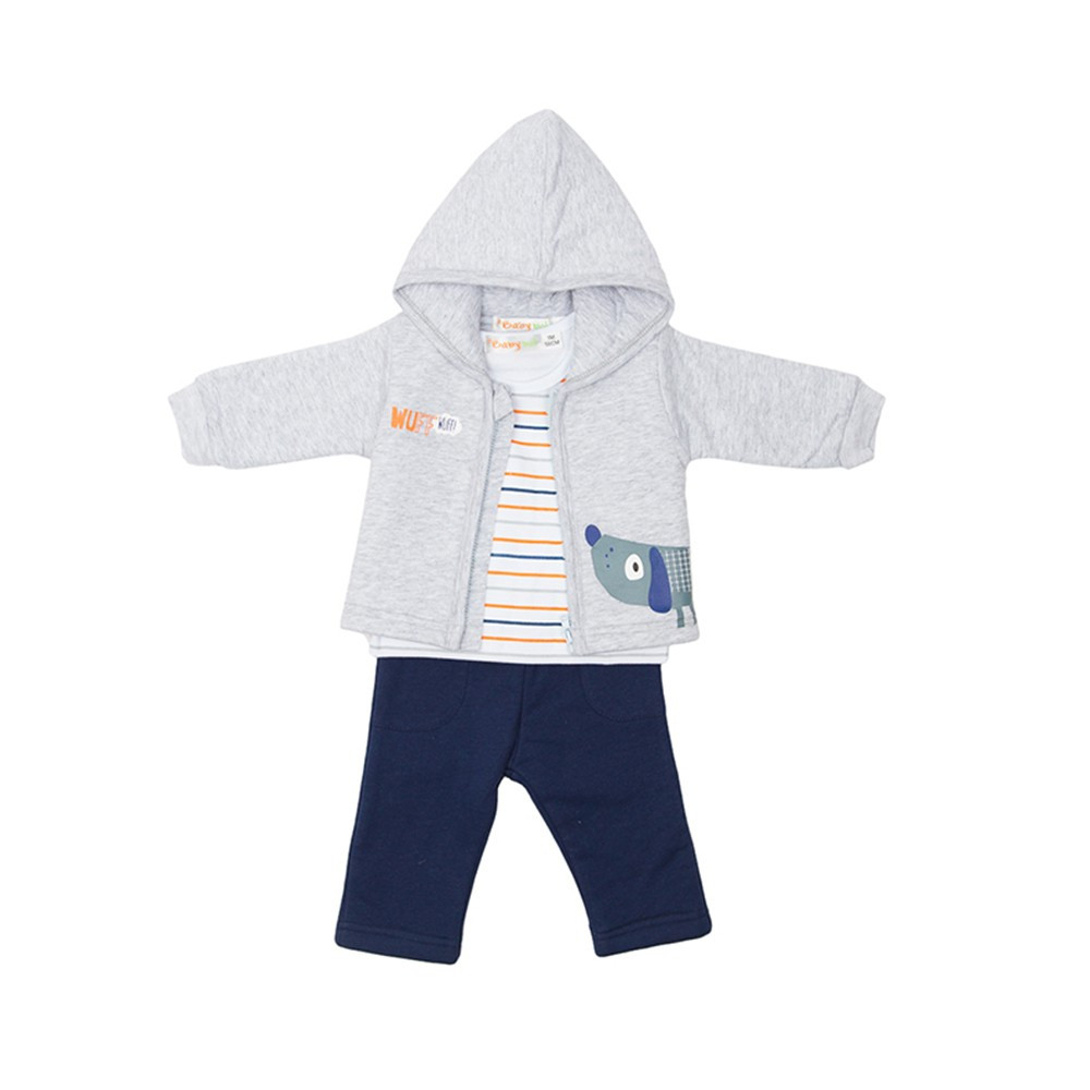 Зручний, модний, стильний комплект стане незамінним варіантом для Вашого хлопчика для щоденних прогулянок за будь-якої погоди. М'які трикотажні прямі штани на еластичному поясі з вшитою гумкою, гумка з тасьмою, що затягується, дозволяє регулювати об'єм талії. Светр з капюшоном на блискавці прикрашає дитячий малюнок. Смугаста футболка застібається на плечі на кнопки, що полегшать та прискорять процес одягання дитини.