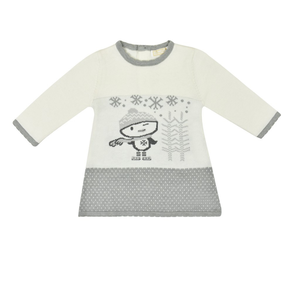Чудовий комплект Babybol для дівчинки складається з в'язаної туніки та трикотажних легінсів. Туніку спереду прикрашає дитячий веселий жаккардовий малюнок на зимову тематику та візерункова кромка на горловині, рукавах та знизу. Застібка туніки розташована на спинці – гудзики. Кромка туніки одного кольору з легінсами. Легінси однотонні на талії в поясі вшита резинка.
