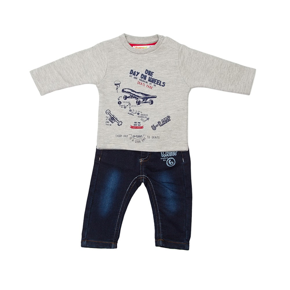 Стильний комплект Babybol сподобається Вашій дитині. Сірий трикотажний реглан із 100% бавовни прикрашений малюнком на спортивну тематику. Застібається регланом кнопками на плече для розмірів 12м, 18м, 24м, що значно полегшує процес одягання малюка. Джинси ніколи не виходять із моди і завжди потрібні у гардеробі Вашої дитини. Об'єм талії в джинсах регулюється вшитою в поясі гумкою, яка затягується і застібається на внутрішні гудзики. У цьому ансамблі Ваша дитина завжди виглядатиме модно та стильно.