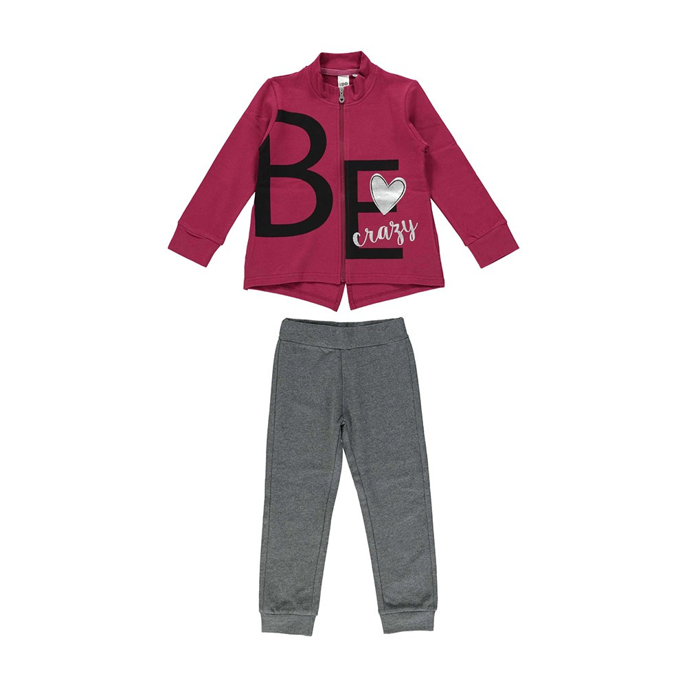 Трикотажний бавовняний комплект іDO складається з толстовки на блискавці та штанів. На толстовку нанесений друкований принт, серце, що ламінує, в тон штанів. Спинка довша за перед і має розріз по центру.Горловина, манжети на рукавах і кісточці, пояс на талії штанів трикотажна подвійна еластична гумка. Пояс на талії має шнурок, що дозволяє регулювати її об'єм.