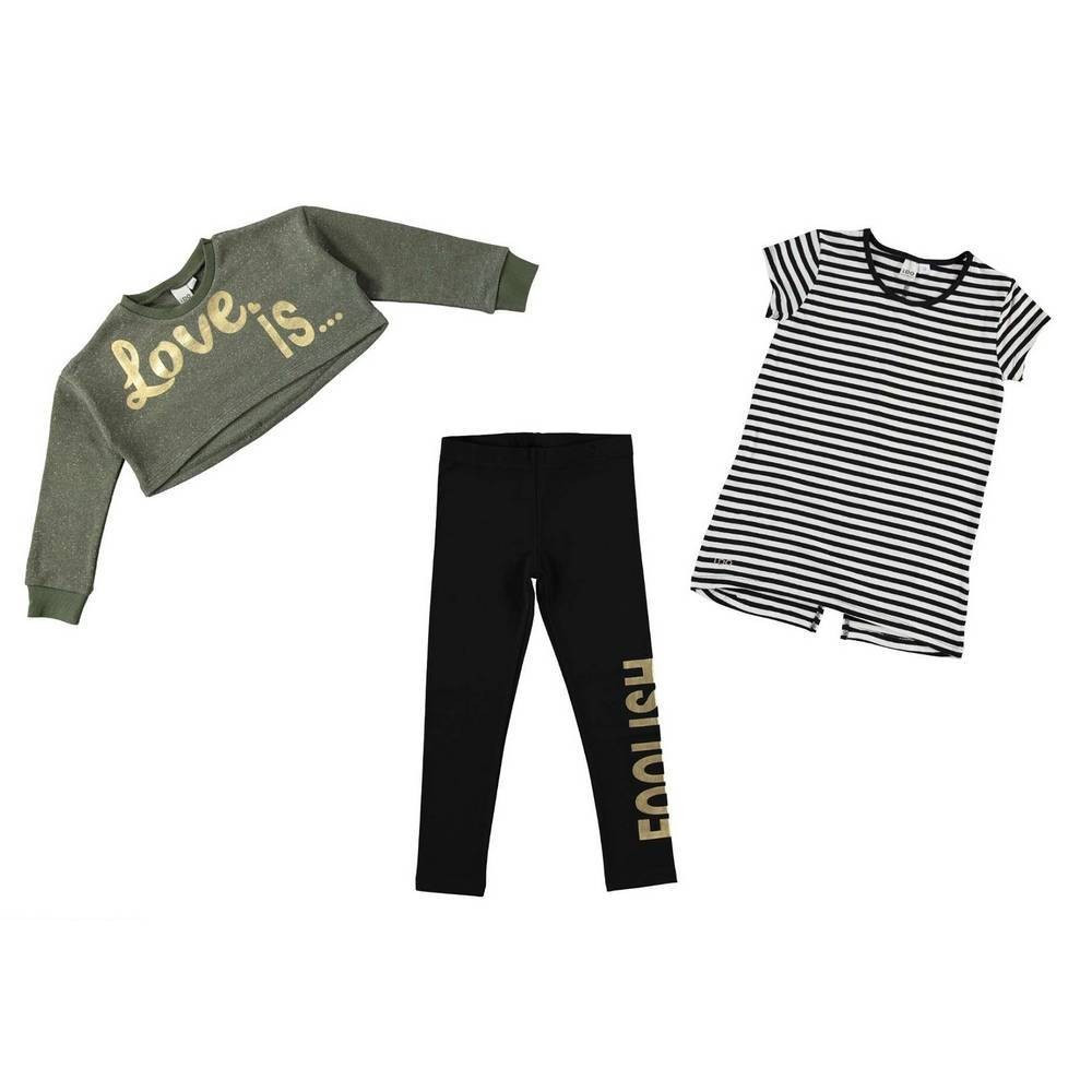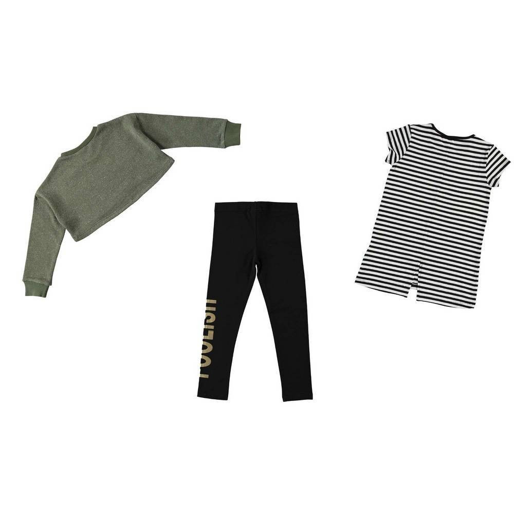 Колір: толстовка - зелений, майка - чорно-біла смугаста, легінси-чорний.
