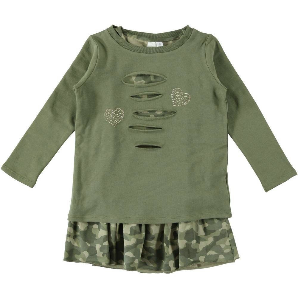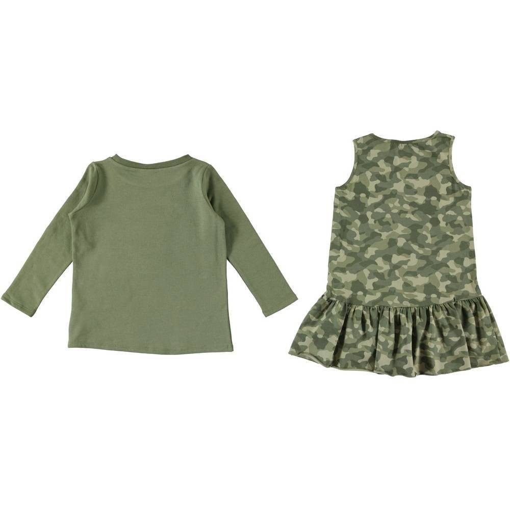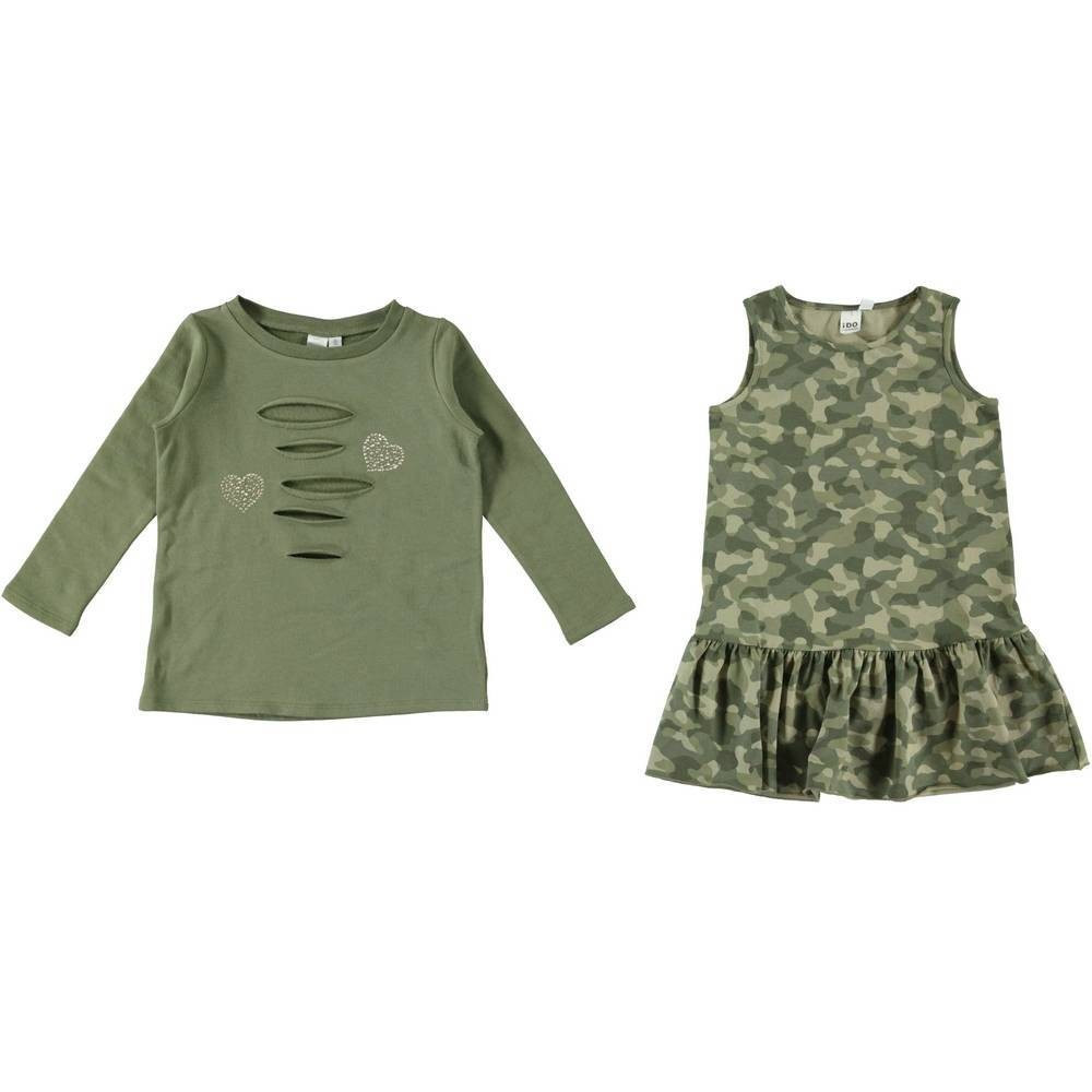 Трикотажний бавовняний комплект іDO складається із сукні без рукавів та реглану. У сукні з забарвленням мілітарі знизу пришита пишна оборка. У однотонного реглану на грудях є розрізи та серця зі стразів.