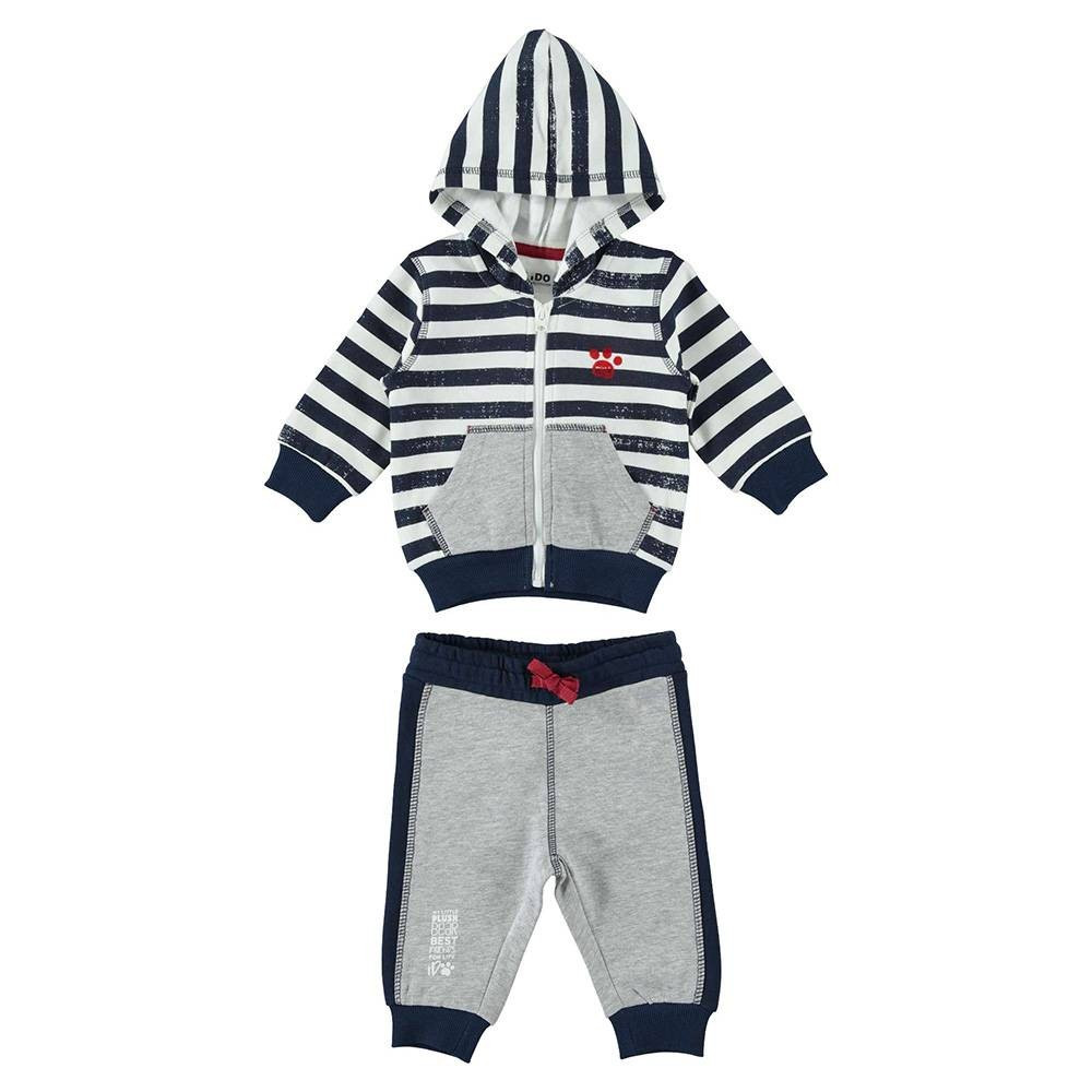 Спортивний трикотажний комплект толстовка та штани не будуть зайвими у гардеробі Вашої дитини. Смугаста толстовка з каптуром, на блискавці, з кишенею кенгуру та відбитком лапки тварини не залишиться поза увагою. Манжети на рукавах, кісточках, пояс на талії толстовки та штанців однотонна подвійна трикотажна гумка. Штани з регульованим обсягом талії, в поясі на талії є тасьма.