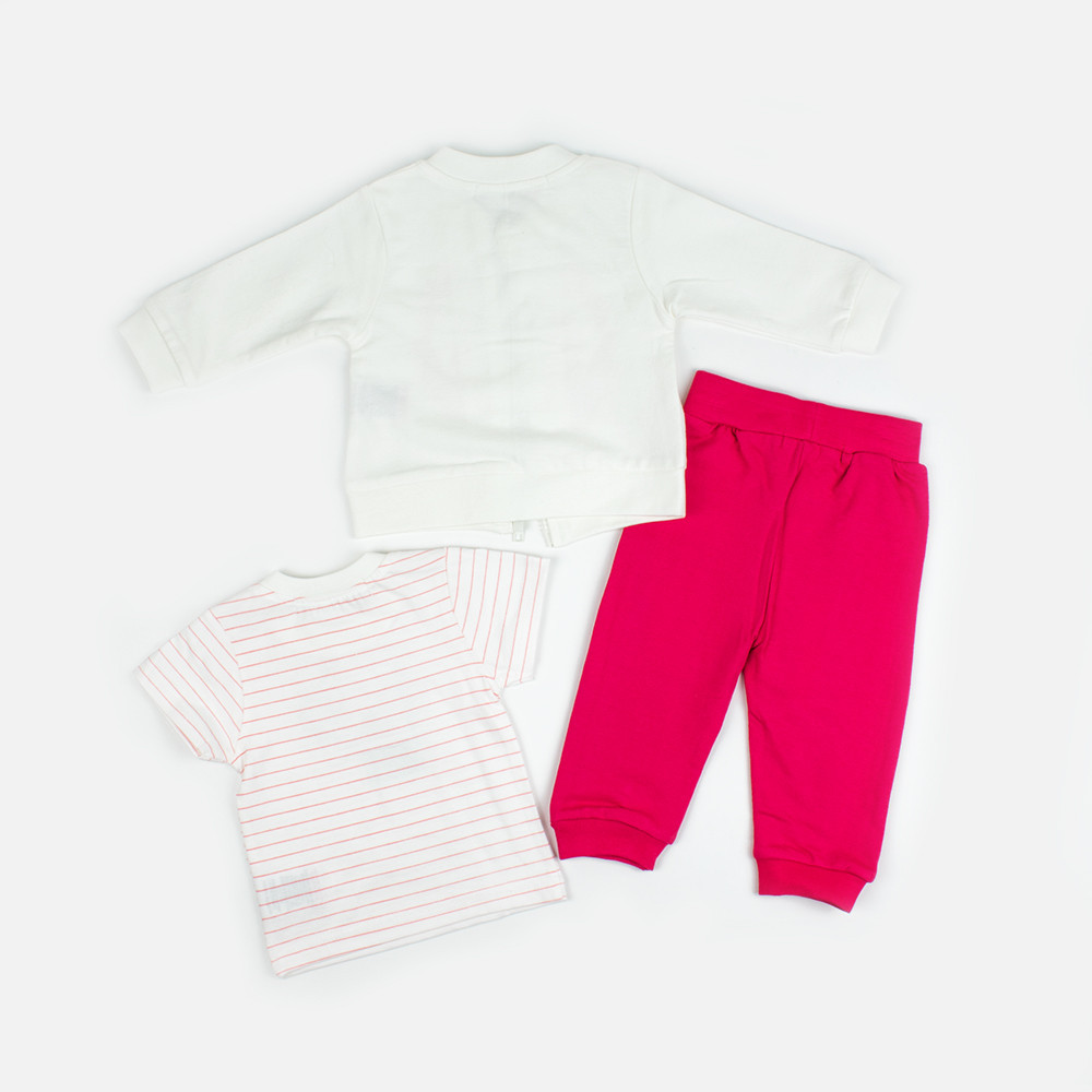 Трикотажний комплект Babybol для новонародженої дівчинки складається з толстовки, футболки та штанців. Комплект виготовлений із 100% бавовни. Толстовка на блискавці спереду прикрашена квітковим принтом у вигляді серця, виріз горловини, манжети, пояс на талії - еластична трикотажна подвійна гумка. Футболка біла з коралову смужку, на плечі є кнопки, для легкого та швидкого одягання. Кнопки розміри від 3 місяців до 3 років. Рожеві штанці на манжетах, пояс на талії на резинці.