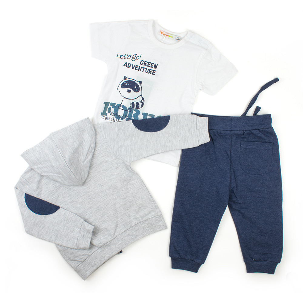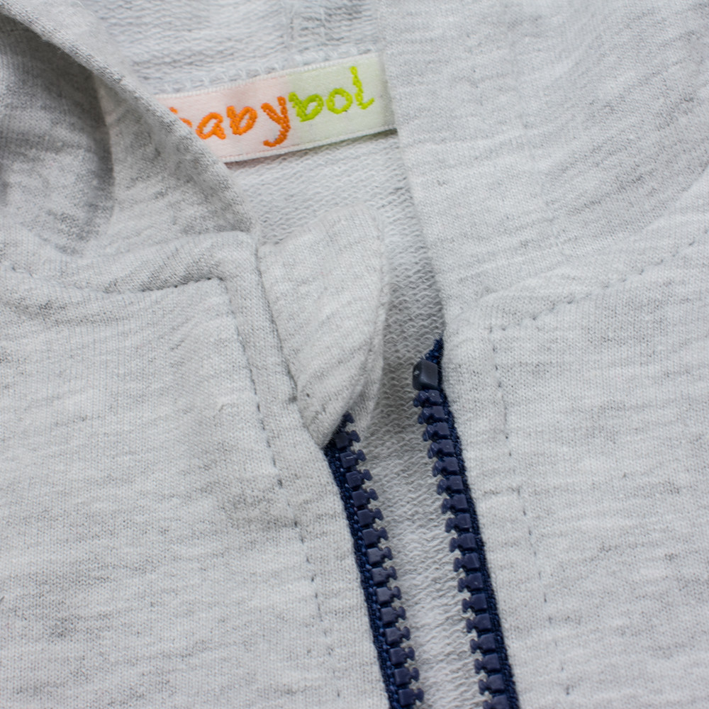 Практичний, модний, стильний трикотажний спортивний комплект Babybol потрібен Вашому хлопчику для щоденних прогулянок. Толстовка з каптуром застібається на блискавку, прикрашена друкарським принтом, налокотники на рукавах одного кольору зі штанами. Футболка прикрашена дитячим малюнком, на плечі є кнопки тільки для розмірів до 3 років, що полегшать і прискорять процес одягання дитини. М'які трикотажні штани на манжеті з прорізними кишенями спереду, пояс з вшитою гумкою, гумка з тасьмою, яка затягується, дозволяє регулювати обсяг талії.