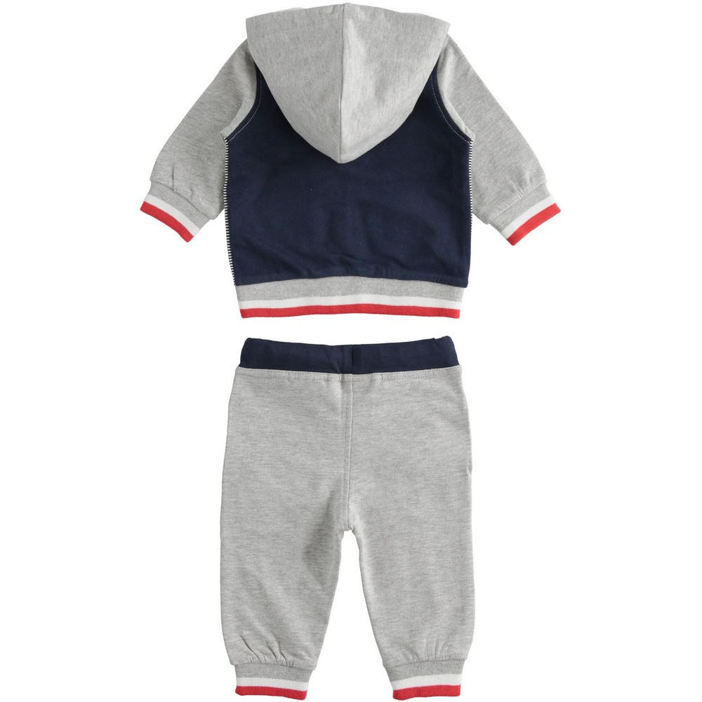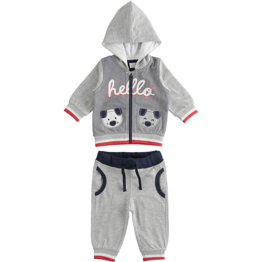 Спортивний трикотажний комплект iDO для новонародженого хлопчика складається з толстовки і штанів не будуть зайвими в гардеробі Вашої дитини. Толстовка з каптуром прикрашена спереду дитячою аплікацією. Низ моделі, манжети на рукавах толстовки і штанців на трикотажній подвійній смугастій гумці. Застібається толстовка на блискавку. Штани з округленими кишенями, однотонною гумкою на талії з внутрішньої кулискою, для регулювання об'єму талії.