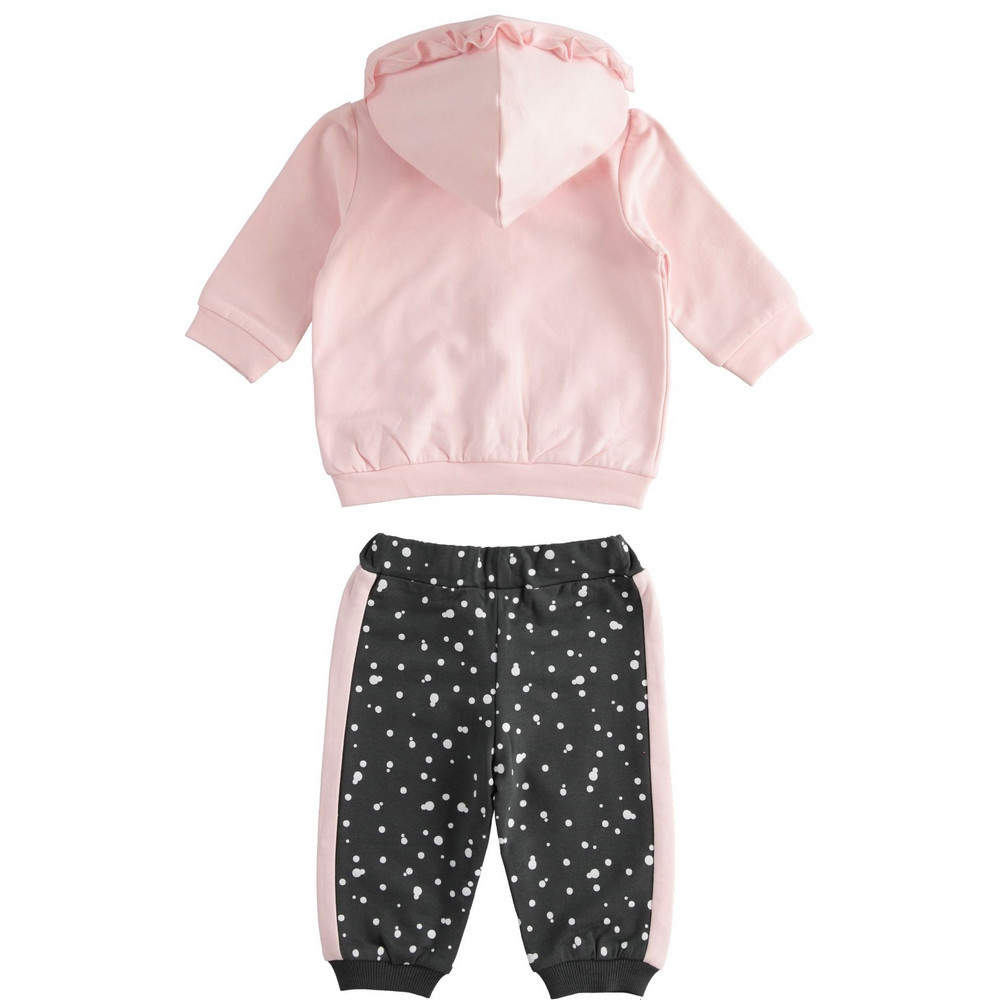 Симпатичний спортивний костюм IDO складається з двох деталей - толстовки з капюшоном і штанів виконаних з трикотажної бавовни. Толстовка застібається спереду на блискавку і декорована принтом і блискітками. Еластичні штани з бічними вставками з таким же принтом, що і толстовка. Пояс на талії на подвійній трикотажній гумці з внутрішнім шнуром, що дозволяє регулювати її обсяг.