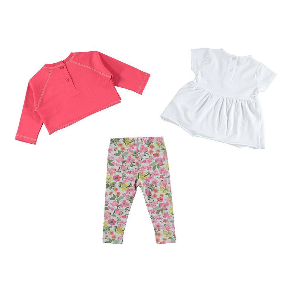 Для практичного повсяк денного одягу iDO пропонує це стильне вбрання, що складається з толстовки, туніки та легінсів. Коротка толстовка виконана з 100% бавовни, з округлою горловиною і прикрашена аплікацією і має бічні розрізи. Нижня частина туніки з пишною оборкою. Толстовка та туніка застібається ззаду на гудзики для розмірів від 6 місяців до 3 років. Кольорові лосини виготовлені зі стрейч-бавовни з квітковим малюнком.