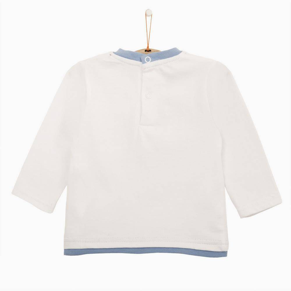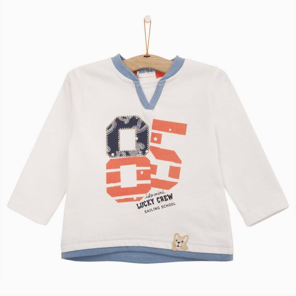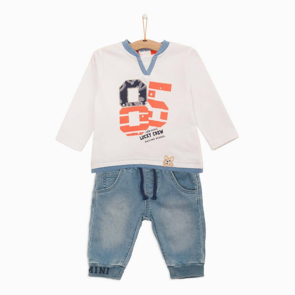 Дуже симпатичний та стильний комплект для Вашого улюбленого малюка. У ньому йому буде дуже комфортно цілий день безперервно. М'який та легкий трикотажний реглан виконаний зі 100% бавовни з V-образною вставкою спереду та принтом. Джинси з легкими потертостями, на широкому подвійному манжеті на кісточці. Пояс на талії з гумкою та шнуром, що дозволяє регулювати об'єм. Комплект буде ідеальним придбанням для гардеробу Вашого малюка на весну та літо.