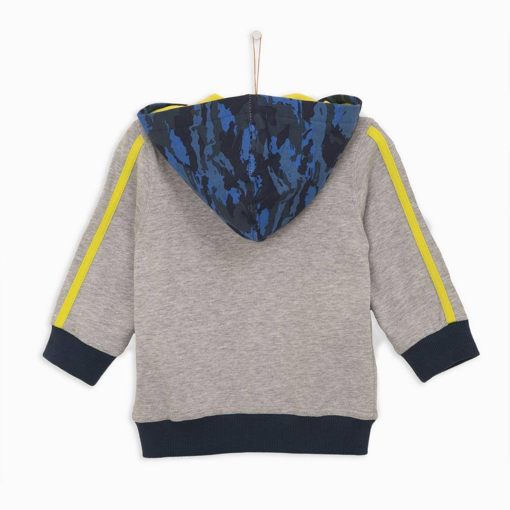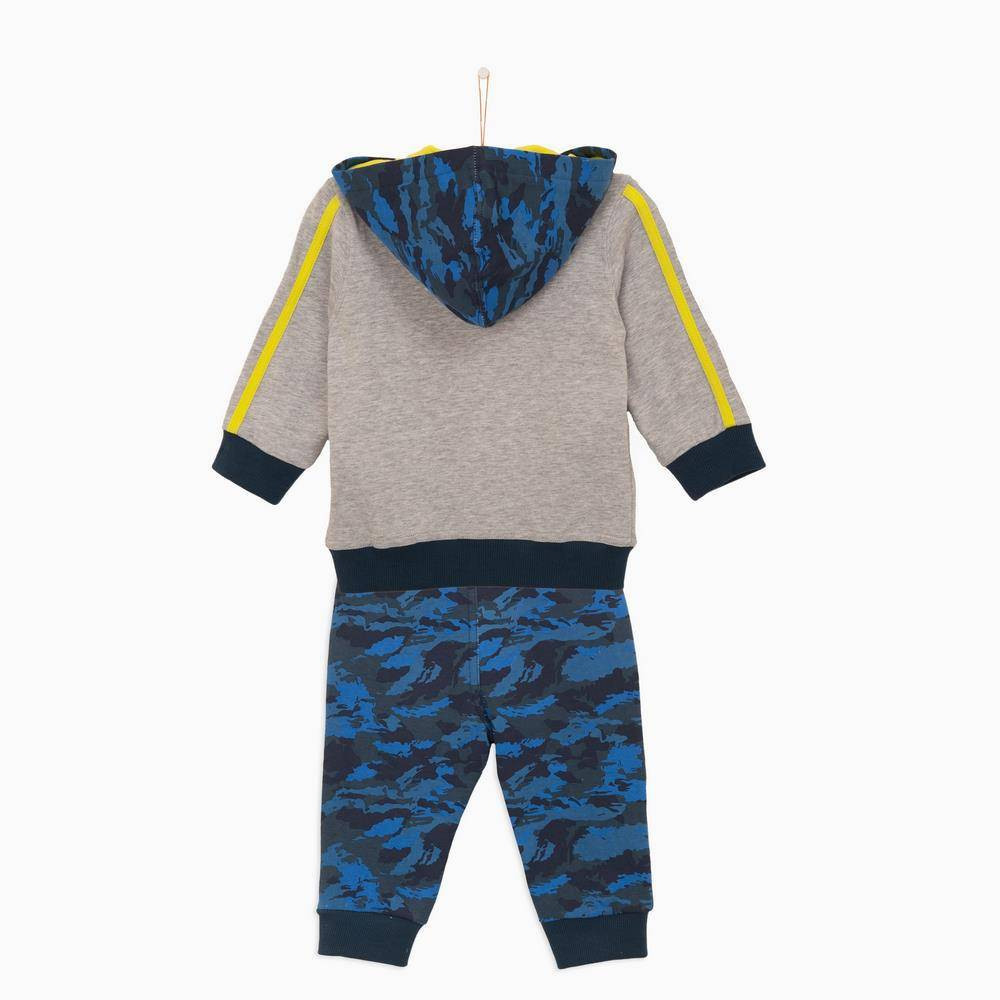 Цей спортивний костюм ідеально підходить для прогулянок. Толстовка на блискавці з каптуром декорована контрастними манжетами та поясом на талії, кольоровим друком спереду та на спинці. Штани з трикотажною однотонною еластичною гумкою на поясі та манжетах, є кишеня кенгуру. Талія регульована вшитим у поясі шнуром.