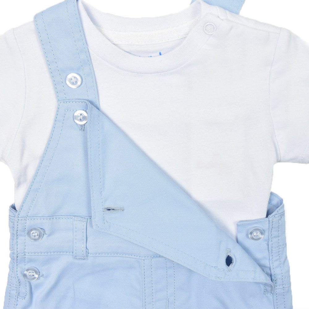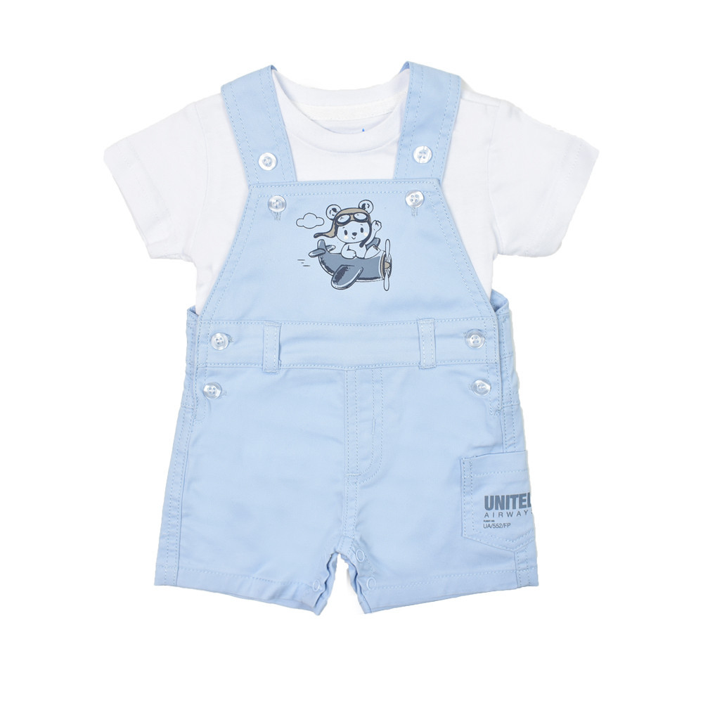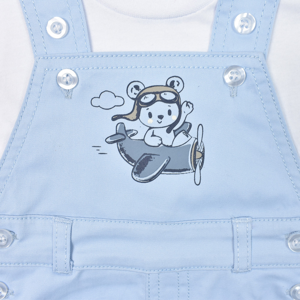 Прекрасний стильний літній комплект Babybol виготовлений зі 100% бавовни, складається з комбінезону і футболки необхідний Вашому новонародженому хлопчику для щоденних прогулянок. Літній короткий комбінезон на лямках з ґудзиками у кілька рядів, що дозволяє регулювати зростання. Ґудзики з боків і кнопки між ніжок полегшать та прискорять процес одягання та зміни підгузника. Прикрашають комбінезон принт по центру та бічна накладна відстрочена кишеня. Однотонна біла футболка з кнопками на плечі полегшить одяг і доповнить Ваш образ.