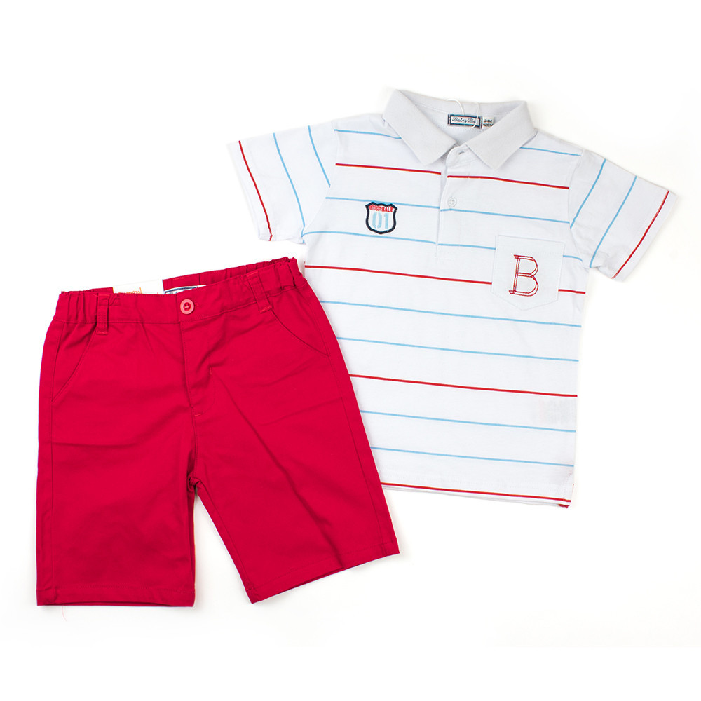 Стильний літній комплект Babybol, що складається з футболки поло і шорт, неодмінно сподобається Вашій дитині. Футболка поло модна та стильна спереду декорована аплікацією та накладною кишенею з вишивкою. Шорти завжди потрібні у літньому гардеробі Вашої дитини. Модні, стильні, яскраві із передніми прорізними кишенями, ззаду кишені обманки із клапанами. Об'єм талії регулюється вшитою в поясі гумкою, яка затягується на внутрішні ґудзики. Гульфік без блискавки, застібка – гудзик. У цьому ансамблі Ваша дитина завжди виглядатиме модно та стильно.