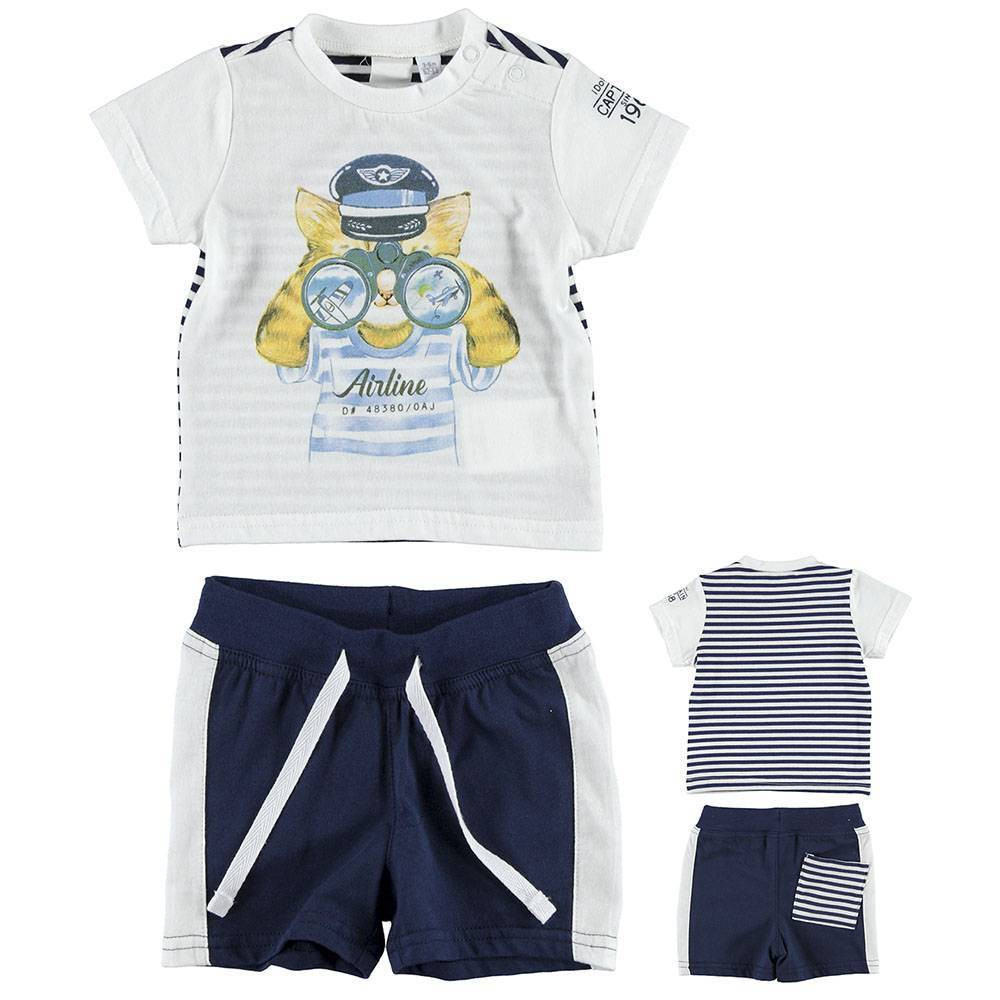 Дуже милий літній трикотажний комплект iDO зі 100% бавовни - футболки та шорти. На футболці спереду малюнок на морську тематику, смугаста спинка. Горловина на трикотажній подвійній гумці, що запобігатиме розтягуванню після прання. Застібається футболка кнопками на плечі, для швидкого та зручного одягання. Пояс на талії шорт - трикотажна гумка зі шнурком, що дозволяє регулювати об'єм талії. З боків шортів пришиті контрастні смужки одного кольору з футболкою.