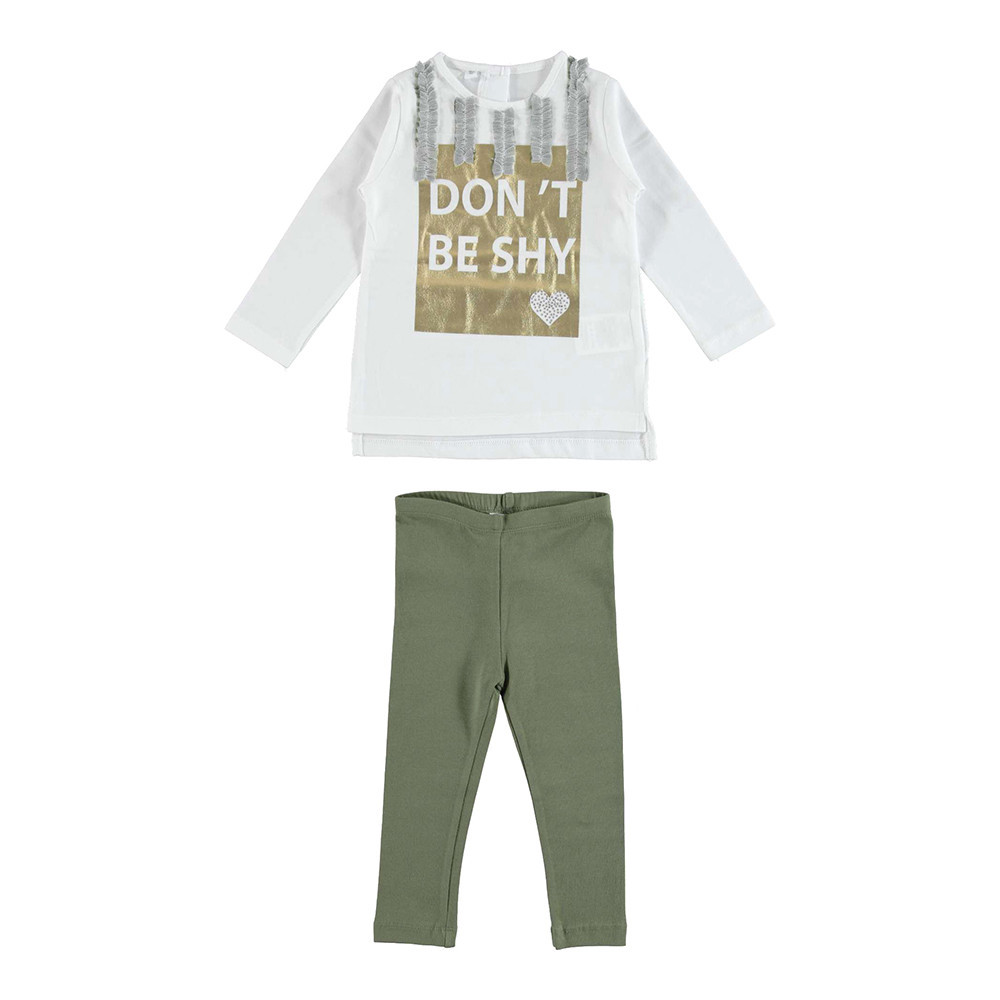 Для практичного, повсякденного одягу iDO пропонує це стильне вбрання, що складається з реглану та легінсів. Реглан виконаний зі 100% бавовни, з округлою горловиною і прикрашений тюль-колянками і ламінованим малюнком, і серцем зі стразів. Нижня частина реглану максі-квадратна і трохи довша за перед. Застібається ззаду на гудзики для розмірів від 6 місяців до 3 років і з отвором у вигляді крапель з гудзиком для розмірів з 3 років. Відповідні лосини їхньої стрейч-бавовни.