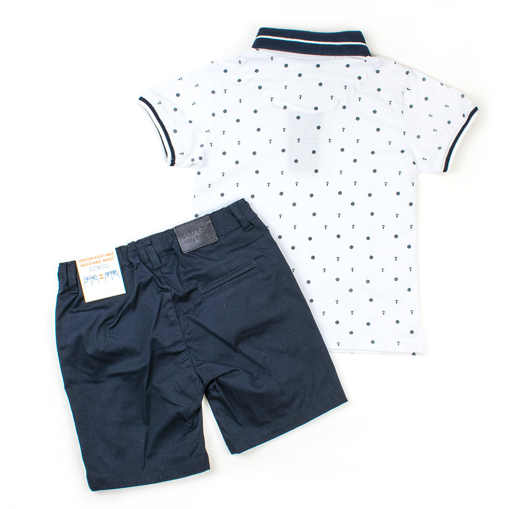 Стильний комплект Babybol, що складається з футболки поло і шорт, неодмінно сподобається Вашій дитині. Трикотажна футболка поло з абстрактним малюнком та накладною передньою кишенею, розрізами з боків, декорована трикотажним однотонним коміром. Застібається спереду на гудзики. Шорти ніколи не виходять із моди і завжди потрібні у гардеробі Вашої дитини. Модні та стильні, з передніми прорізними кишенями. Об'єм талії регулюється вшитою в поясі гумкою, яка затягується на внутрішні гудзики. Гульфік без блискавки, застібка – гудзик. У цьому ансамблі Ваша дитина завжди виглядатиме модно та стильно.