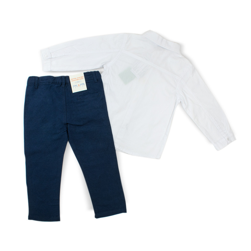 Стильний комплект Babybol, що складається з сорочки та штанів сподобається Вашій дитині. Однотонна класична сорочка модна та стильна, застібається на гудзики по центру. Прикрашає сорочку накладна кишеня. Класичні однотонні штани завжди необхідні у гардеробі Вашої дитини. Модні та стильні звужені знизу, об'єм талії регулюється вшитою в поясі гумкою, що затягується, та застібається на внутрішні ґудзики.