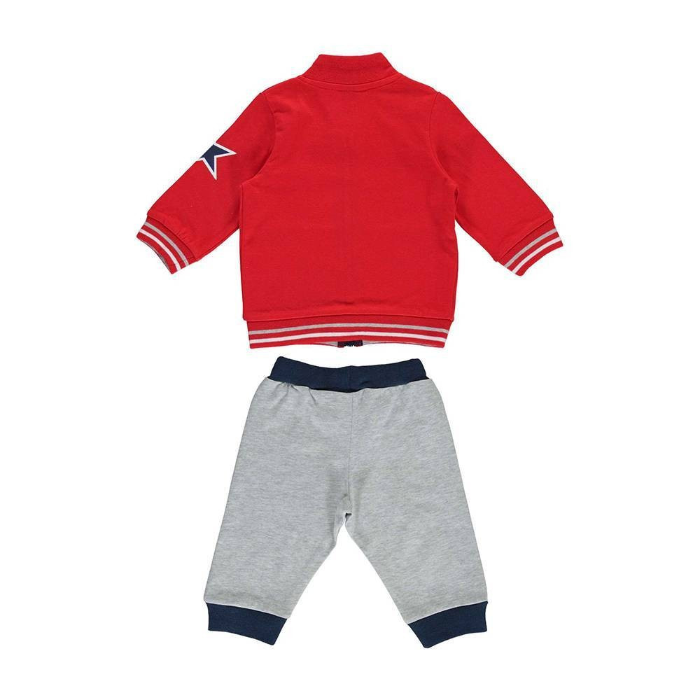 Зручний, модний, стильний спортивний комплект стане незамінним варіантом для щоденних прогулянок за будь-якої погоди. М'які трикотажні штани, вільна модель на еластичному поясі з вшитою гумкою, гумка з тасьмою, що затягується, знизу штани на подвійному трикотажному манжеті, з боків пришита яскрава тасьма. Светр на блискавці для зручного та швидкого одягання дитини. Трикотажна гумка з контрастними смугами на манжетах запобігає розтягуванню після прання. Светр прикрашає спереду аплікація.