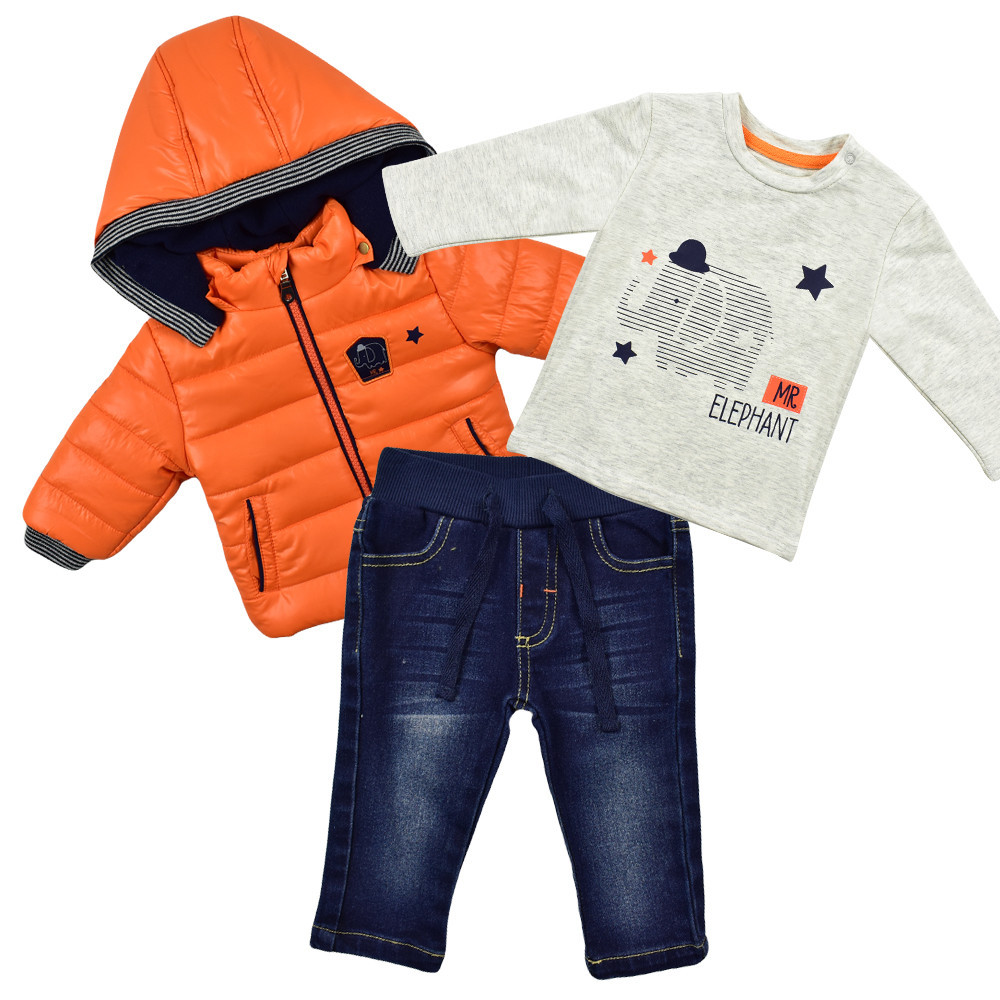 Цвет | куртка - помаранчевий, реглан - сірий, джинси - синій |