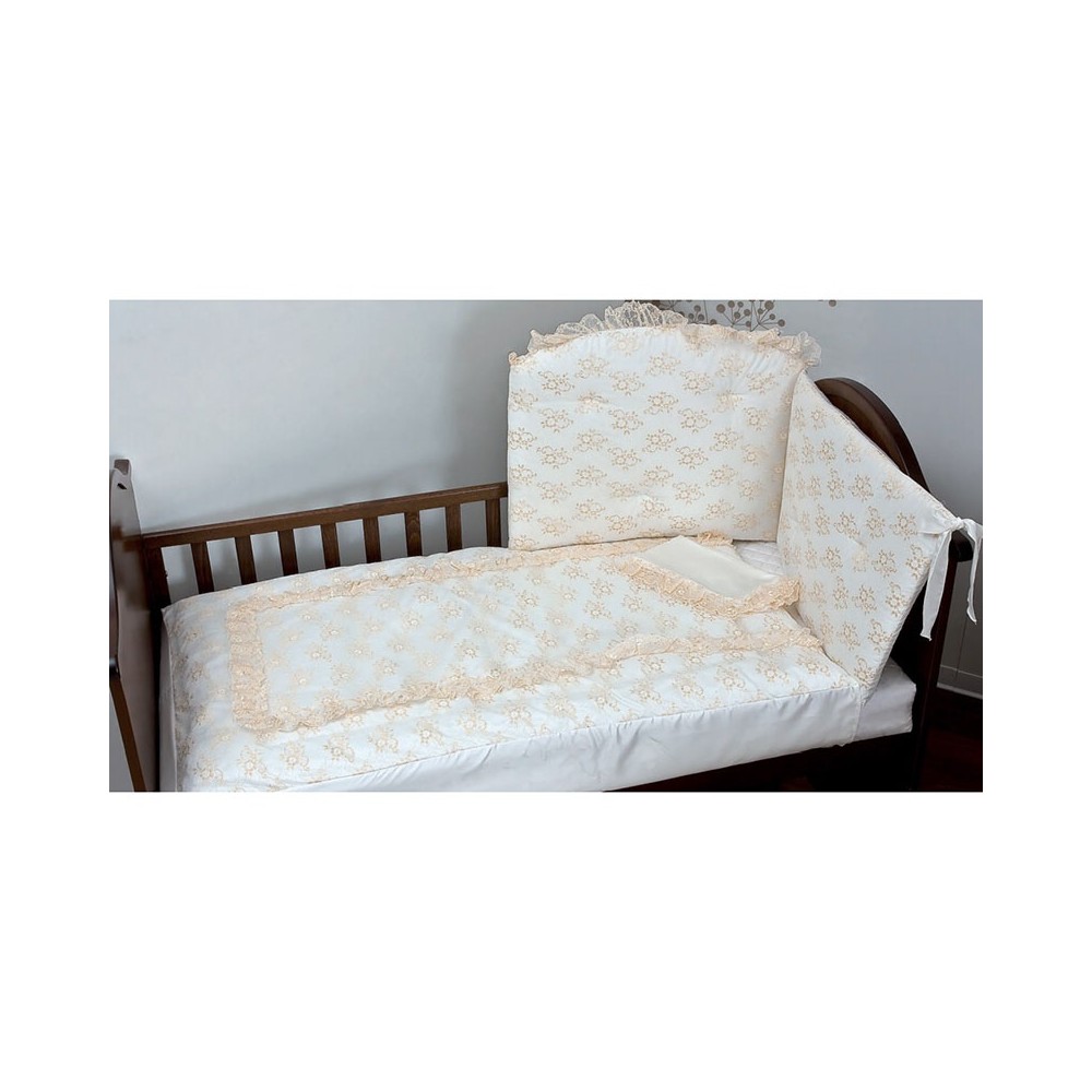 Постільний комплект з 100% бавовни - ідеальний для новонароджених. Барвисті і ніжні кольори цієї білизни не будуть стомлювати і дратувати очі вашого малюка. Білизна декоровано аплікацією та мереживом. Ковдра з екологічно чистим наповнювачем, 3-х сторонній бортик, простирадло, підодіяльник, наволочка - в комплекті. Комплект упакований в силіконову сумку на блискавки.