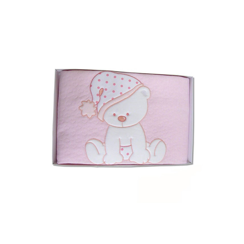Ковдра прикрашена зображенням симпатичного ведмедика в нічному ковпаку. Матеріали м'які і приємні на дотик, не дратують ніжну шкіру малюка. Ковдра виконана в спокійному, ніжному кольорі.