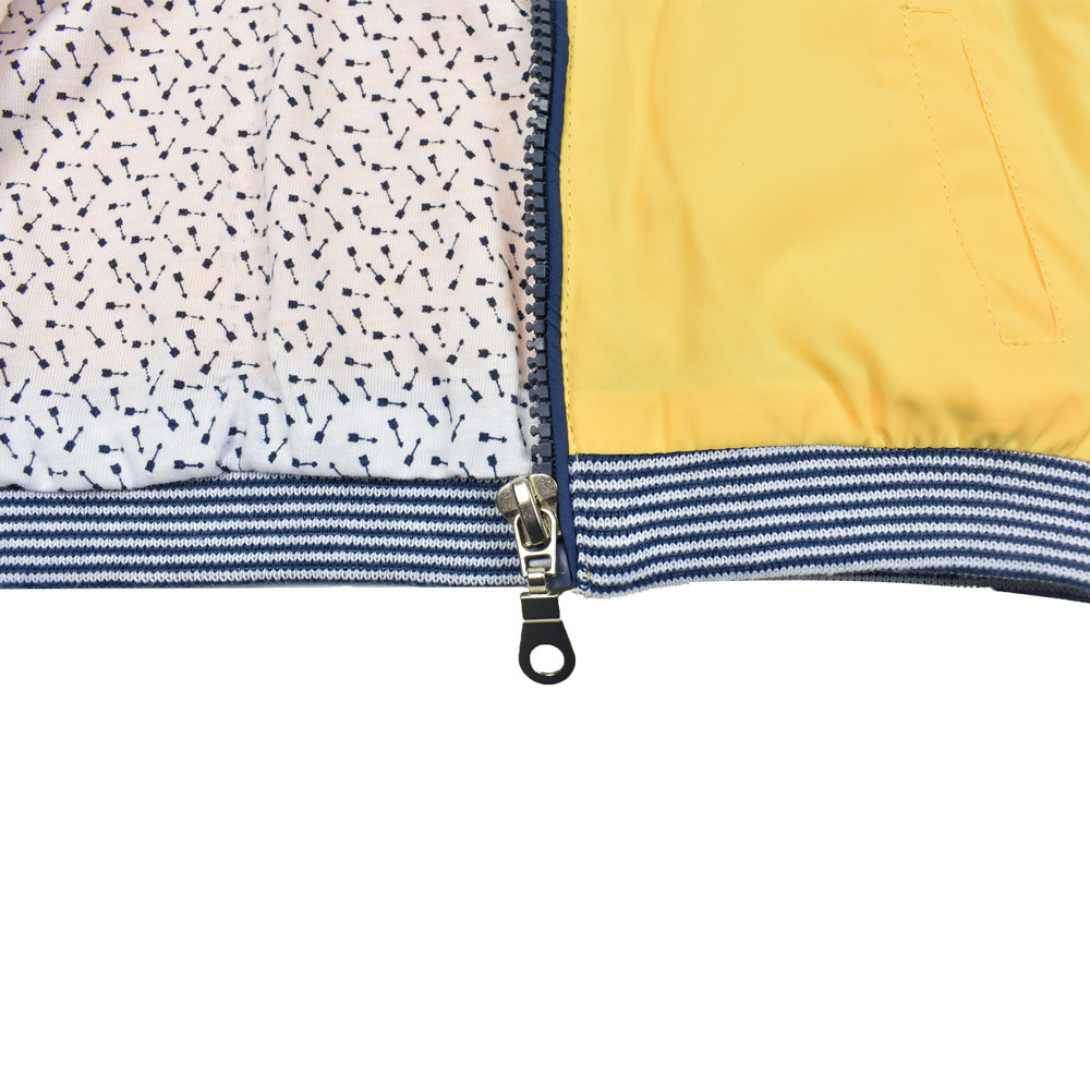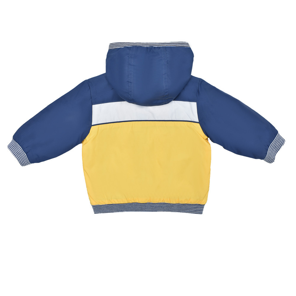 Вітровка з каптуром Babybol - необхідна річ у гардеробі Вашої дитини. Вітровка кольорова - плечі, каптур та рукави темно-сині низ жовтий. Трикотажна подвійна еластична гумка на поясі талії, манжетах рукавів та навколо каптура. Трикотажна бавовняна підкладка із принтом по всьому полю. Перед декорований контрастним друкарським принтом та кишенями у рамці. Куртка застібається на блискавку.