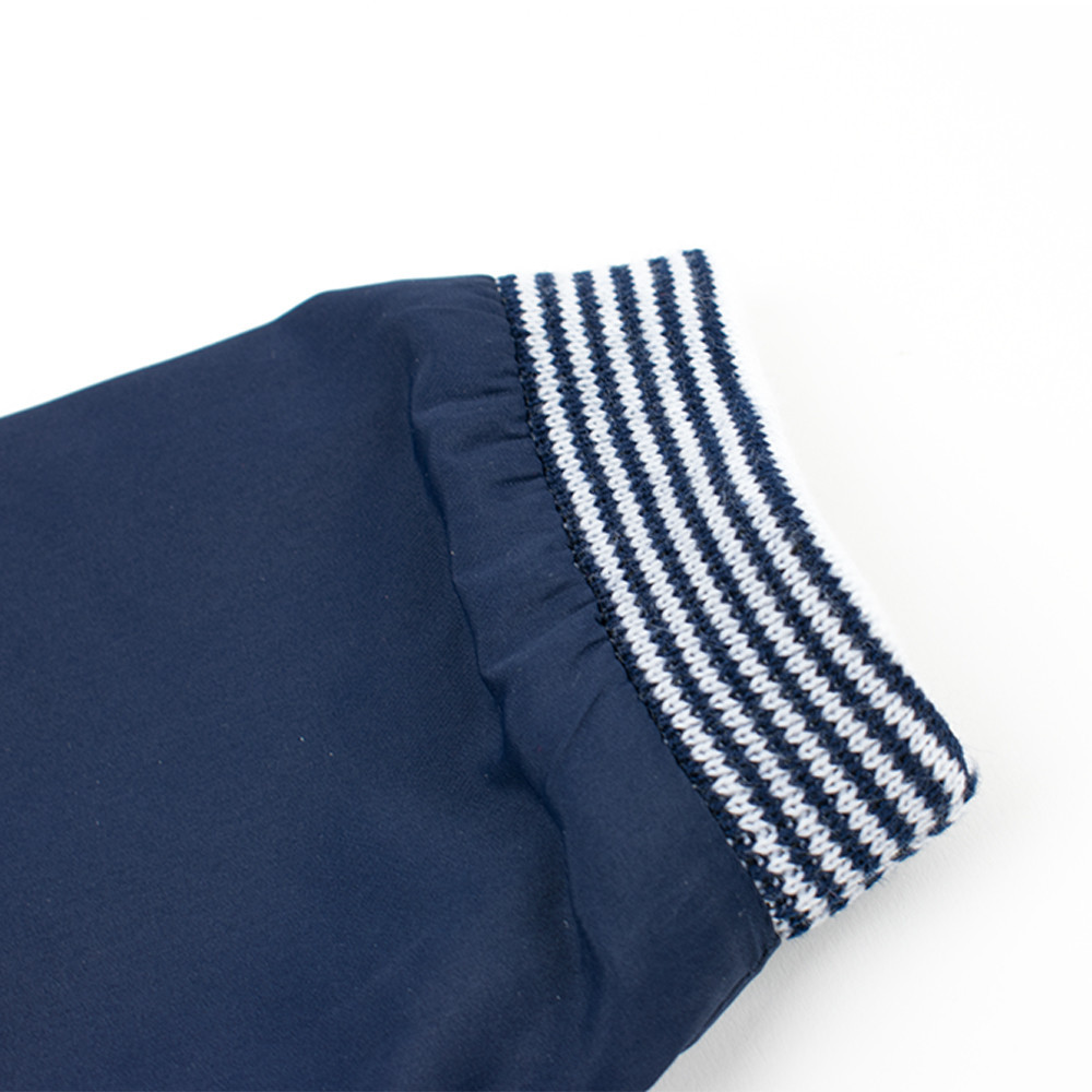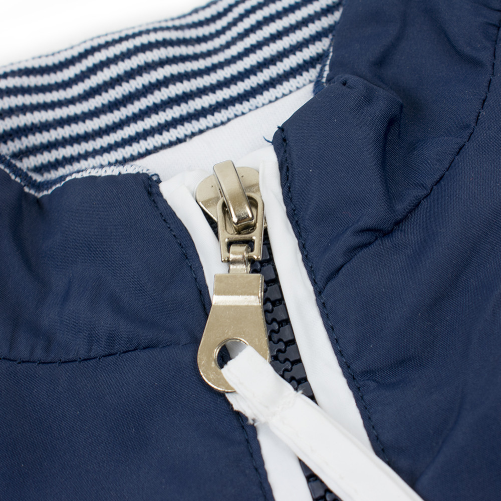 Куртка вітрівка Babybol необхідна річ у гардеробі Вашої дитини. Вітровка однотонна перед декорований контрастною емблемою, трикотажна подвійна смугаста еластична гумка на поясі талії та на манжетах рукавів. Трикотажна бавовняна підкладка з принтом по всьому полю, кишені у рамці. Куртка застібається на блискавку.