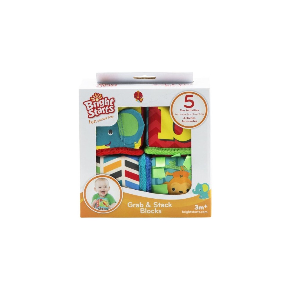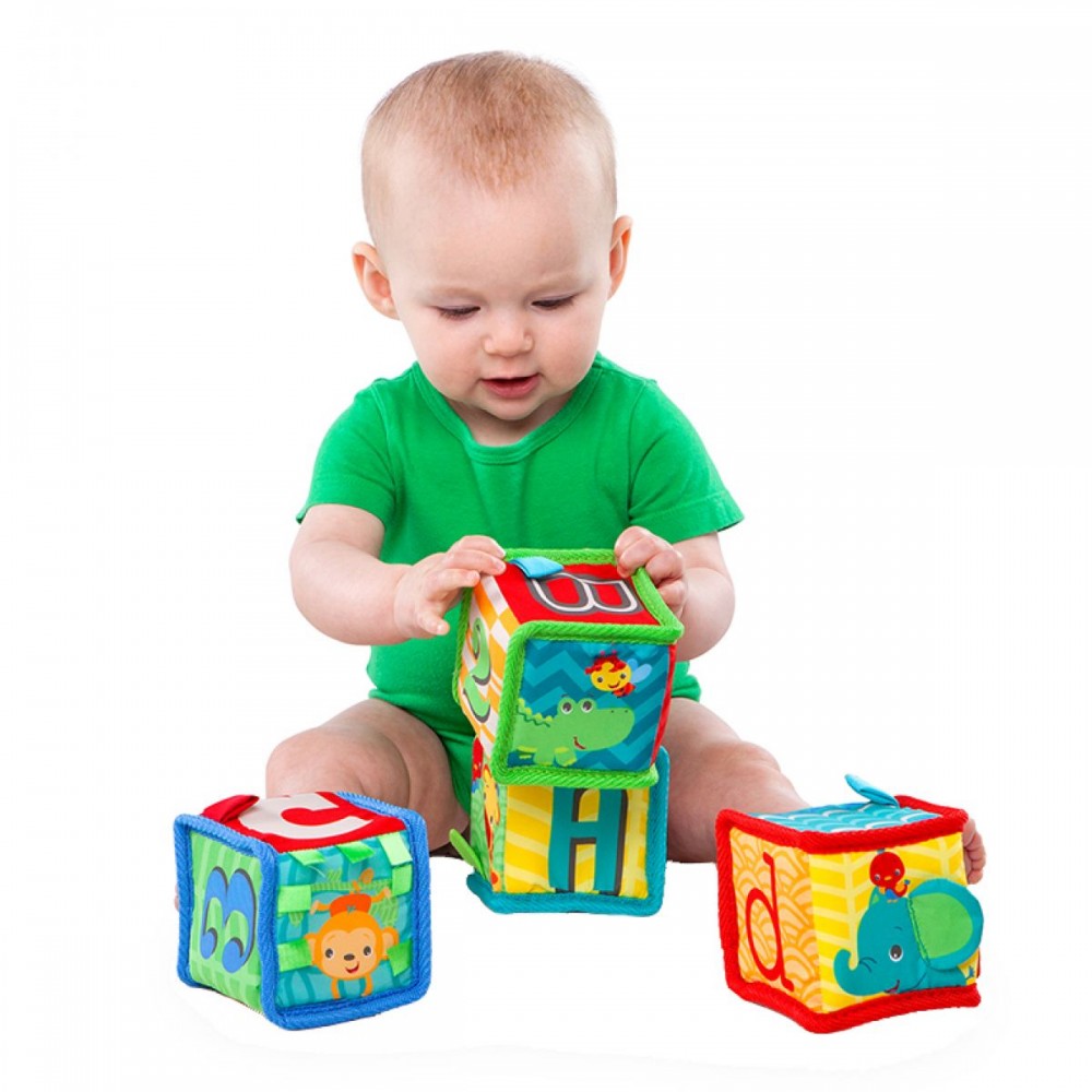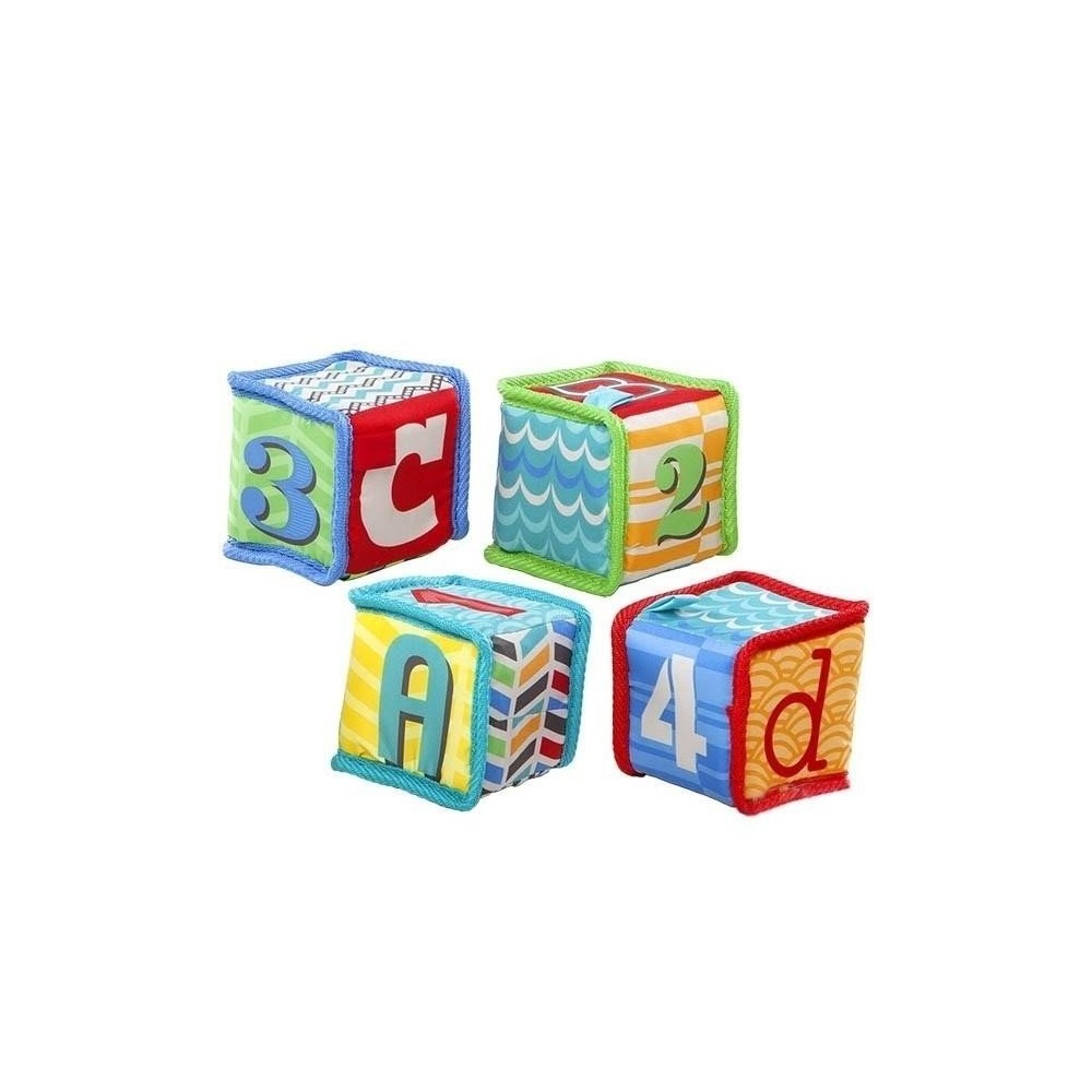 4 м'яких кубика Kids II Веселе навчання покриті тканиною різної текстури з шелестять шовковими стрічками і шнуром-кантиком. Торохтять і дзвенять, якщо потрясти. На кожному кубику зображена цифра, буква англійського алфавіту, кумедна звірятко і різнобарвний контрастний візерунок. Кожен кубик має петельку для кріплення на дугу ігрового центру або коляску.