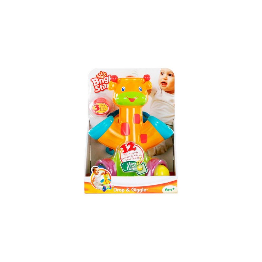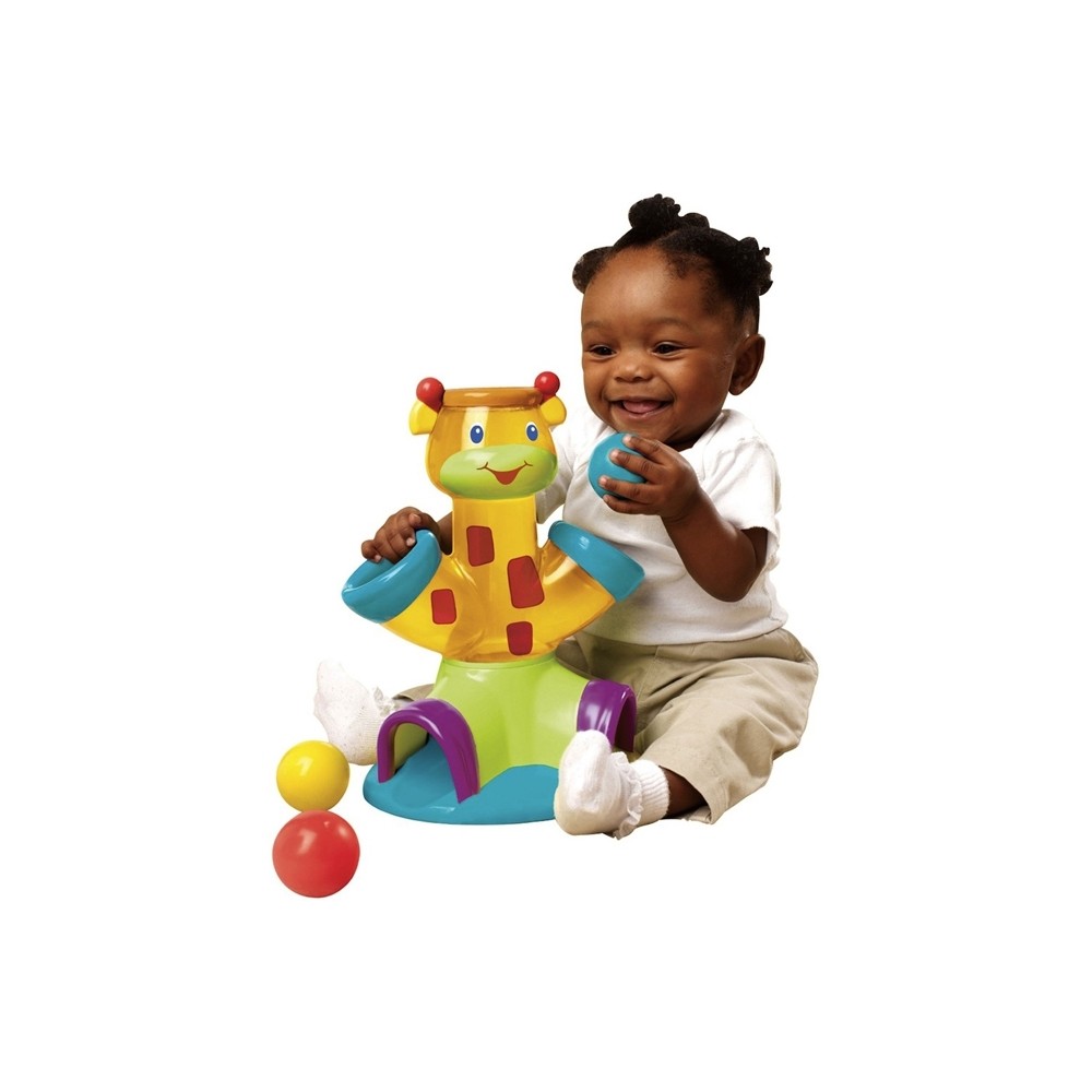 Малюк буде захоплено грати з веселим жирафом. Малюк кидає кульки в отвори і спостерігає за їх рухом через прозорий животик. Коли кульки стосуються дна, жираф видає 12 кумедних звуків. Тулуб обертається, таким чином, блокуються проходи і кульки залишаються всередині, що робить гру більш цікавою. Іграшка дуже зручна, 3 яскравих кульки можна легко вистачати маленькими ручками. Розвиваюча іграшка Bright Starts Музичний жираф з мячікамідаст можливість малюкові розширити знання про навколишній світ. З цієї симпатичної іграшкою малюк буде розвивати дрібну моторику ручок, тактильні відчуття, а завдяки різноманітним квітам буде розвиватися зір малюка. У комплекті з жирафом йде 3 м'ячика, які під час гри треба кидати в отвори в голові і руках. Жираф при цьому видає смішні звуки і м'ячики викочуються з отворів в ногах.