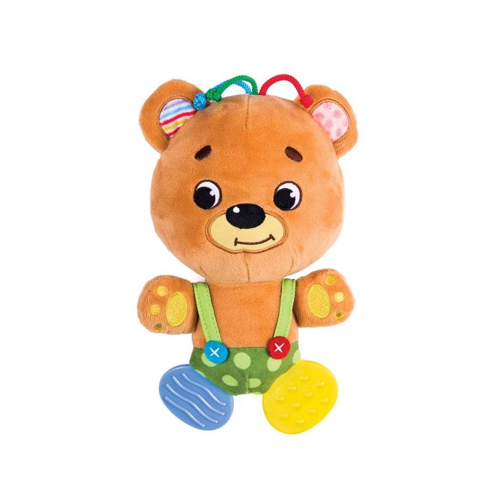 Наявність музичного модуля, прорізувачів та інших елементів роблять її багатофункційною. Коричневе ведмежа виготовлене з приємного на дотик плюшу з коротким ворсом, у нього м'який наповнювач. Мордочка вишита гладкими нитками, без дрібних виступних елементів. Вушка виготовлені з тканини іншої фактури з контрастним забарвленням, подібним до смуг і кружечків. На голові еластична мотузка. Ведмедик одягнений у милий зелений комбінезон із двома ґудзиками червоного й блакитного кольору. Лапи з прорізувачами блакитного та жовтого кольору виготовлені з екологічно чистого та безпечного пластику.