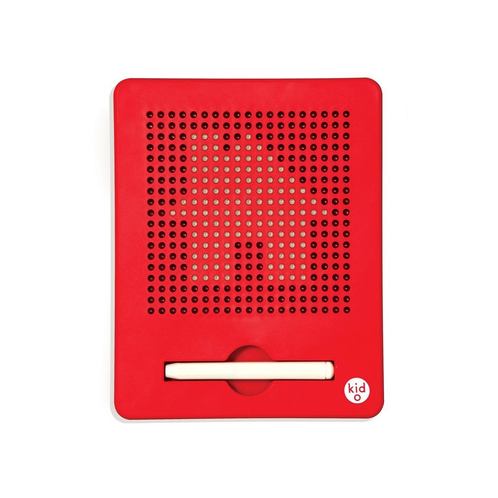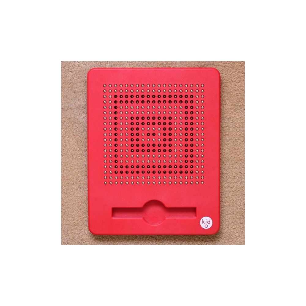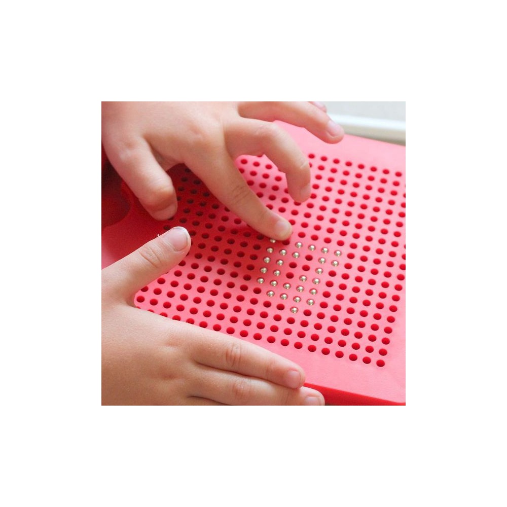 Малювати на цій дошці треба магнітним олівцем, і не простими сірими лініями, а металевими кульками! Саме тому поверхня дошки вся вкрита дірочками — у них будуть слідом за олівцем підніматися кульки, створюючи малюнок.