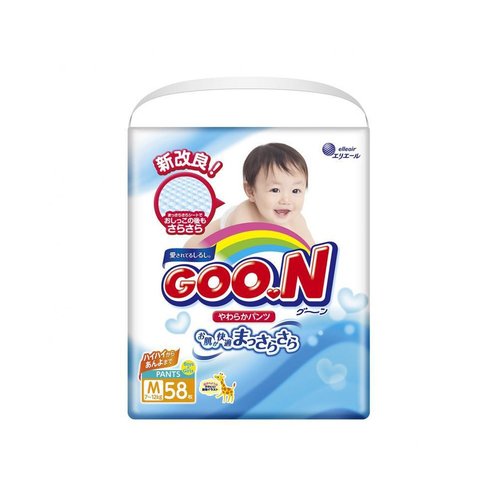 Підгузки-трусики Goo.N M для дітей вагою від 6 до 12 кг. Підгузки-трусики мають м'яку сітчасту зовнішню поверхню, через яку пропускається повітря всередину підгузка та виводиться назовні піт, що дає змогу зберегти шкіру малюків сухою. Для дітей вагою 5-9 кг, які почали крутитися уві сні, у новій колекції трусиківє унікальний розмір трусиків Goo.N М. Він прискорює перехід від звичайних підгузків до трусиків. І саме в цьому розмірі — особлива внутрішня рельєфна поверхня, яку виготовлено за технологією fuwo poko. З оновленої упаковки усміхаються діти, які знають, що Goo.N — знак турботи та любові!