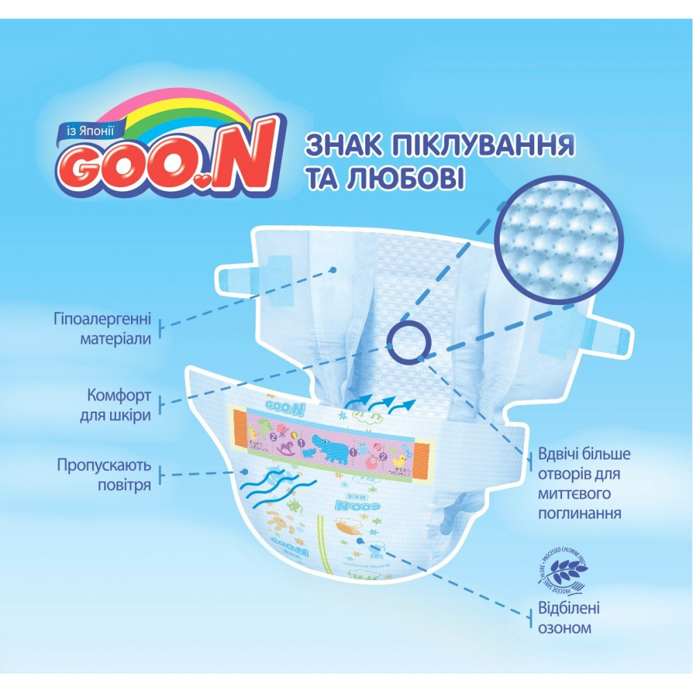 Трусики Goo.N — дуже тонкі, не нагріваються всередині та запобігають парниковому ефекту. Еластичні бокові гумочки підгузків-трусиків Goo.N забезпечують одночасно і м'якість, і чудове прилягання до дитячого животика, з огляду на його зміни упродовж дня.