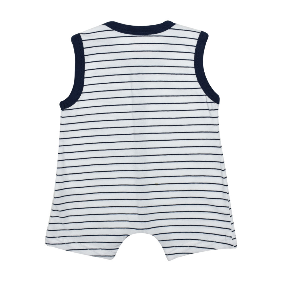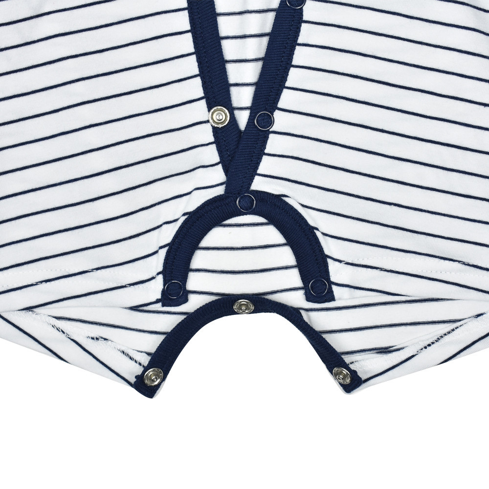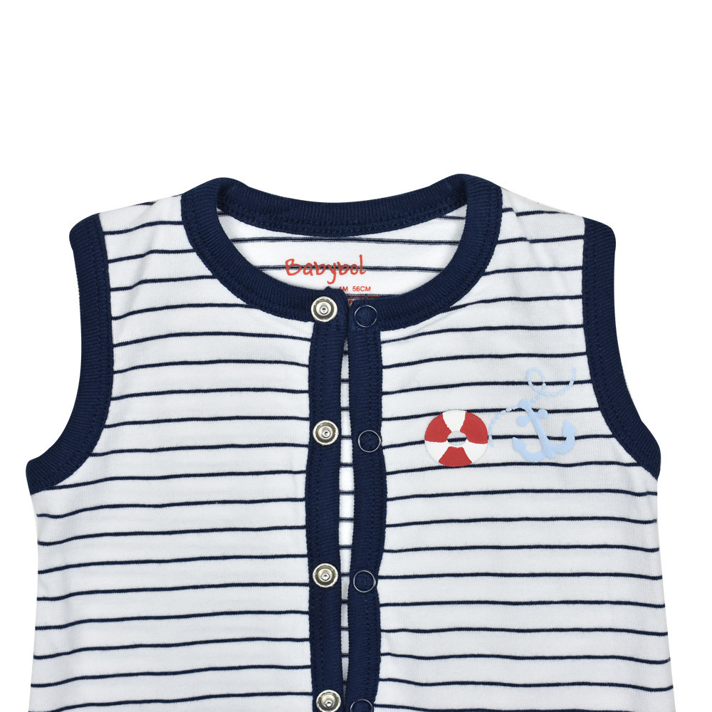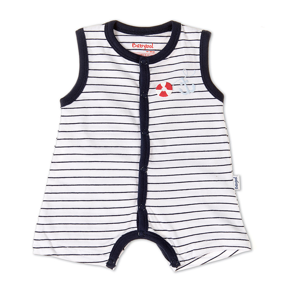 Дуже зручний одяг для спекотного літнього дня - м'який пісочник-майка Babybol з натуральної, дихаючої бавовни. Смугастий пісочник без рукавів декорований у центрі переду дитячим малюнком на морську тематику. Горловина, пройма, поличка спереду окантовані контрастною трикотажною гумкою. Застібається спереду на кнопки, є кнопки між ніжками для зручності зміни підгузка. Вільний крій пісочника не обмежує рухів дитини, в ньому не жарко і зручно. Відмінний вибір для прогулянок, пісочниці, пляжу.