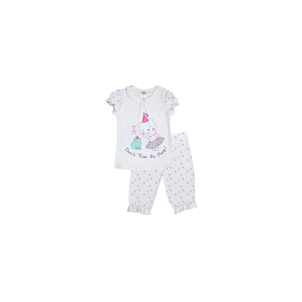 Шикарна трикотажна зі 100% бавовни (ажурна гумка) літня піжама для дівчинки складається з футболки та шортів. Тканина м'яка, приємна на дотик, добре пропускає повітря, не викликає алергічних реакцій. Однотонна футболка з дитячим малюнком та кольоровими рукавами з рюшами одного кольору із шортами. Вашій малечі буде зручно і комфортно відпочивати в такому одязі.