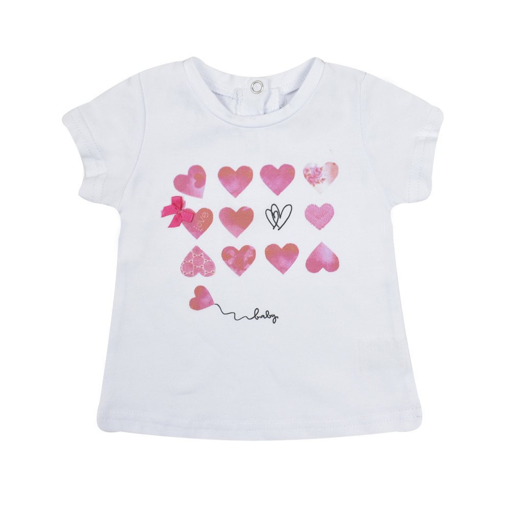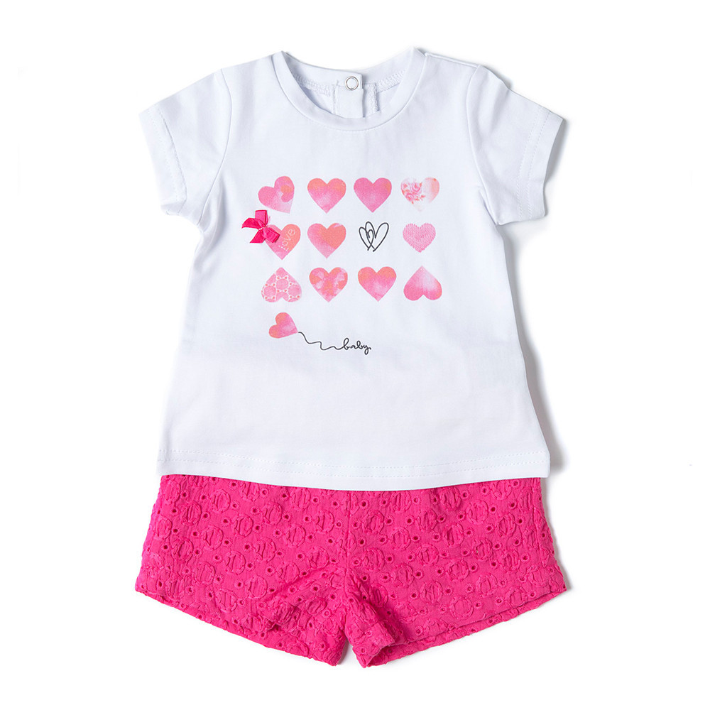 Літо не за горами. А ви підготувалися до його приходу? Babybol пропонує чудовий стильний літній комплект для дівчинки – однотонну футболку та ажурні шорти. Вільна футболка з невеликими рукавами спереду декорована принтом у вигляді серця та бантиком. Застібка на спинці – кнопки. Кнопки є тільки для розмірів до 3 років, щоб полегшити та прискорити процес одягання. Шорти на підкладці, пояс на талії, еластична гумка, що дозволяє регулювати обсяг талії.
