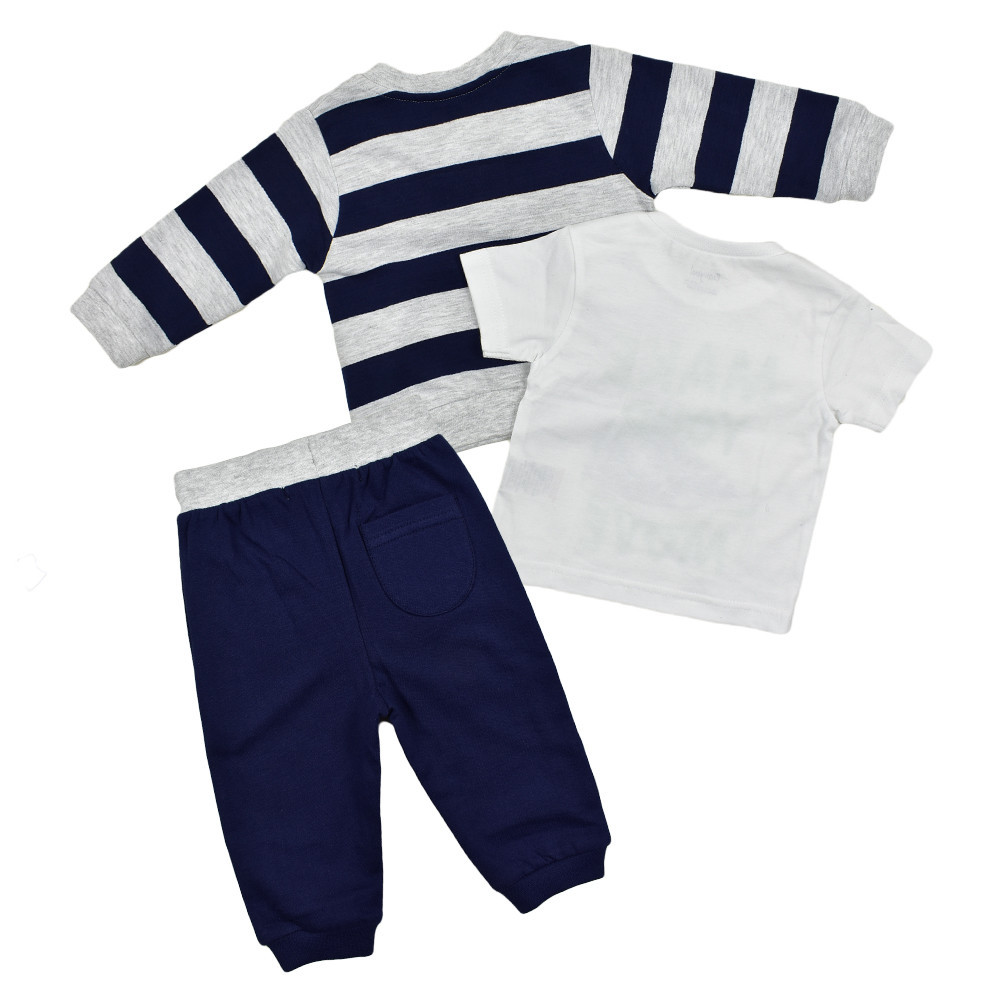 Колір: толстовка - сірий, футболка- білий, штани- синій.